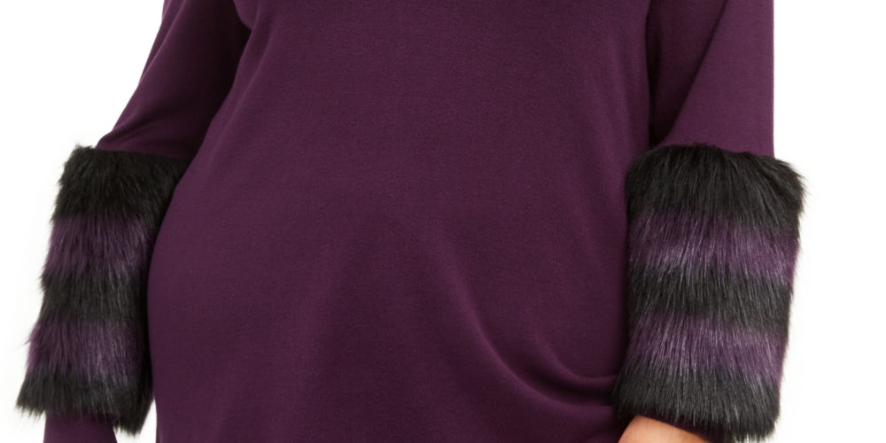 Mock turtleneck|Striped; faux-fur cuffs at long sleeves|Body; rayon/nylon; faux fur; acrylic/modacrylic/polyester|Dry clean