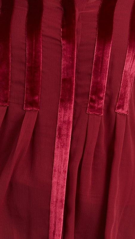 Model is wearing a size 2X|Crewneck; front button closures|Velvet trim throughout|Long sheer sleeves|Shell, sleeves, trim, lining: polyester|Machine washable