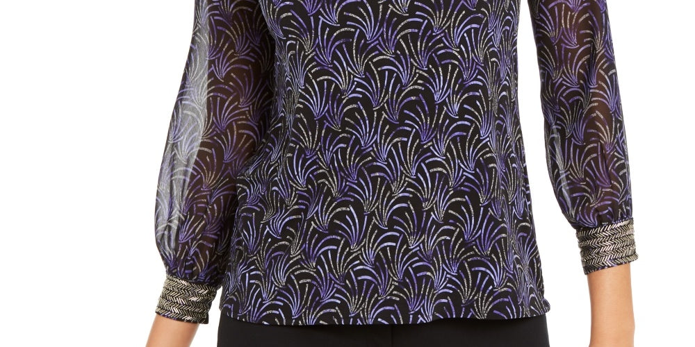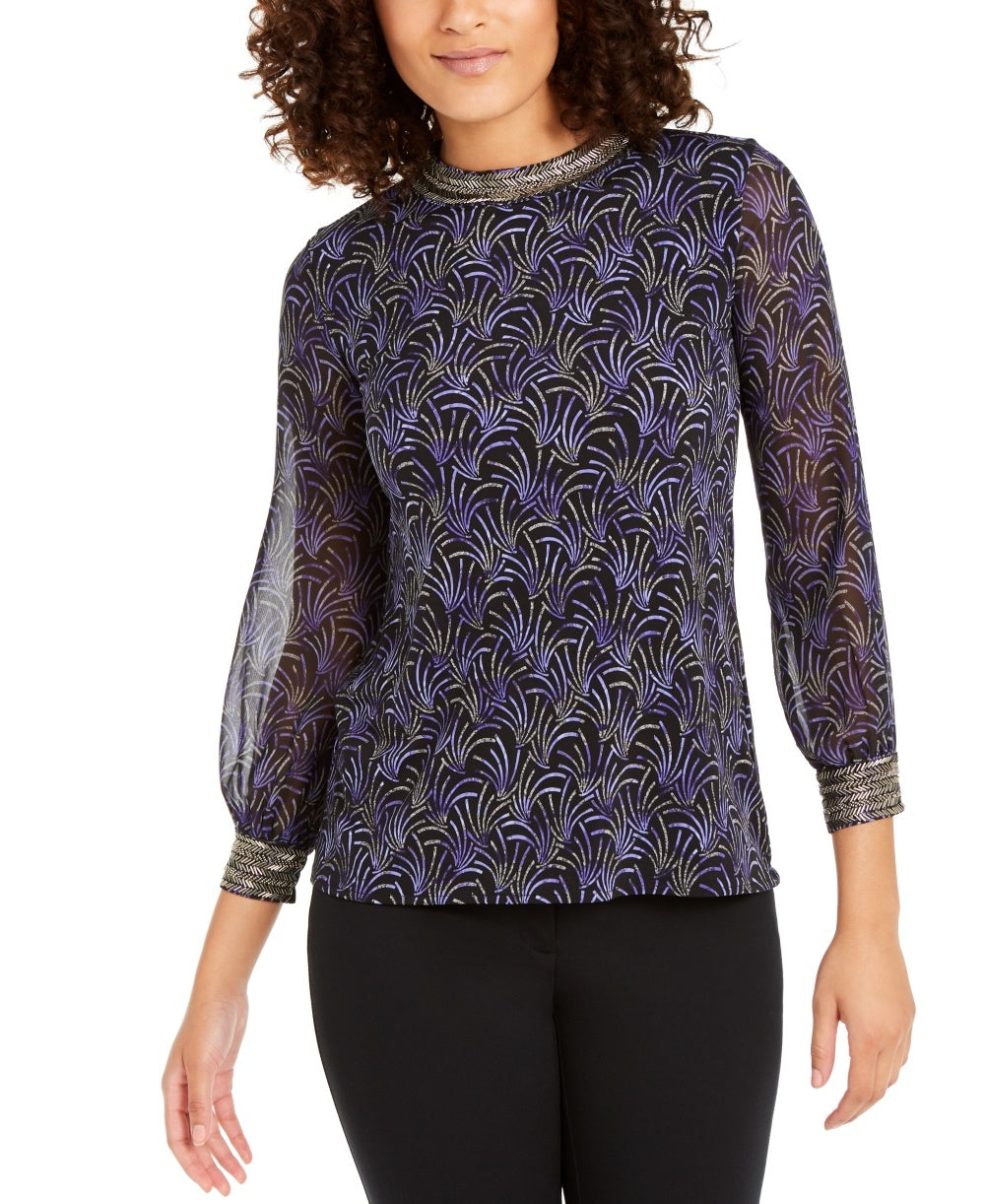 Hits at hip|Designed to fit and flatter 5'4" and under frame|Mock turtleneck; buttons at back neckline|Embellished at neckline and cuffs|Polyester/spandex; sleeves: polyester