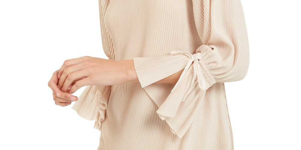 Designed to fit and flatter 5'4 and under|Mock-neckline; keyhole stay-put closure at back neck|Bell 3/4-sleeves|Embellished at neck; ribbon tie at sleeves