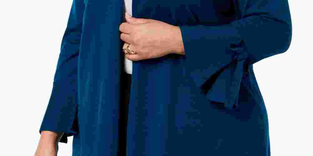 Open front; no closures|Bell sleeves with bow-tie detail at cuffs|Hits at hip|Rayon/nylon|Machine washable