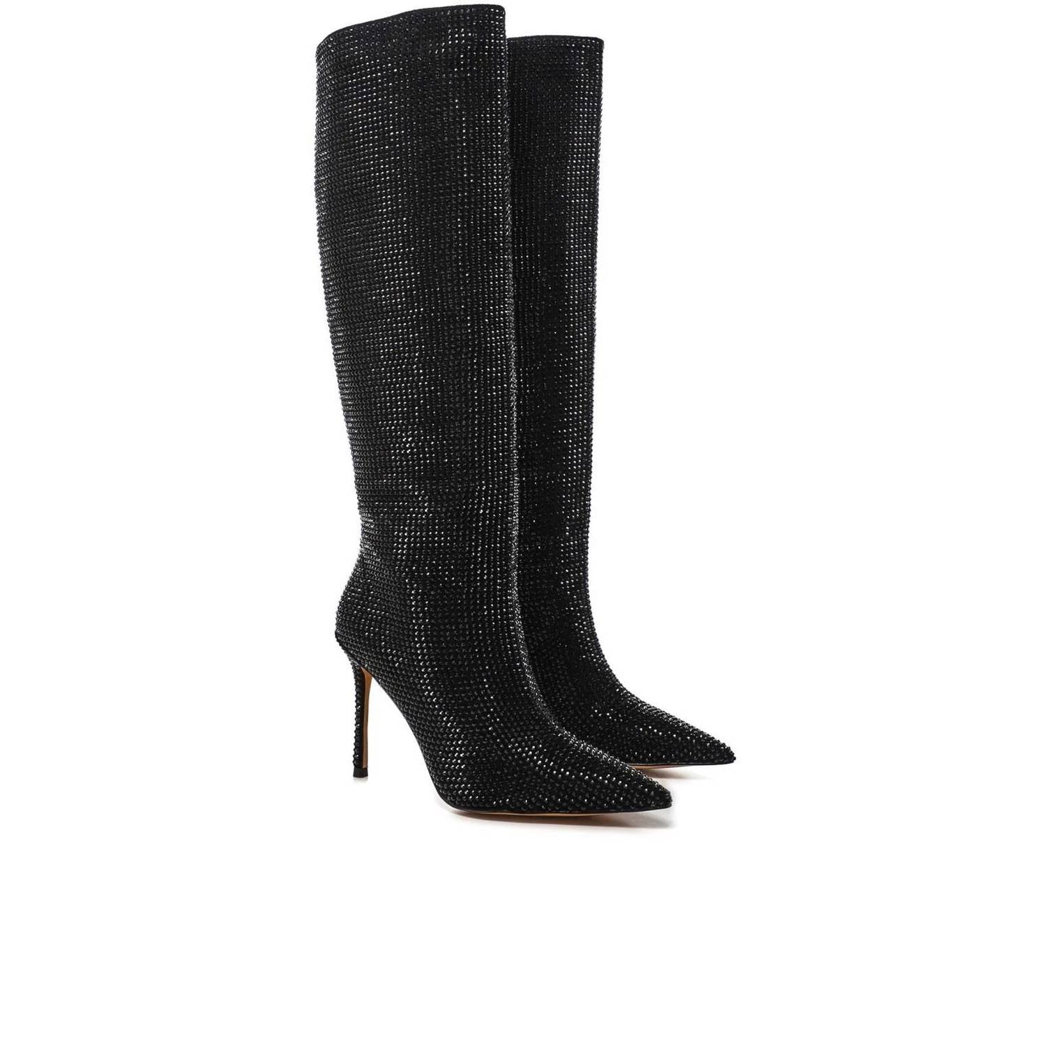Upgrade your shoe game with these classic heeled boots, designed to merge sophistication and style. Comfortable enough for long days or a night out on the town. Step into the spotlight with the Women's Bossy Sequin Knee High Top Boot by Alias Mae, a stunning choice for evening events. These maximalist black heeled boots boast a high stiletto heel, perfect for making a bold statement. With a pointed toe shape, they bring a sleek edge to your spring wardrobe. Designed for women, they offer a stylish option for those who dare to stand out.