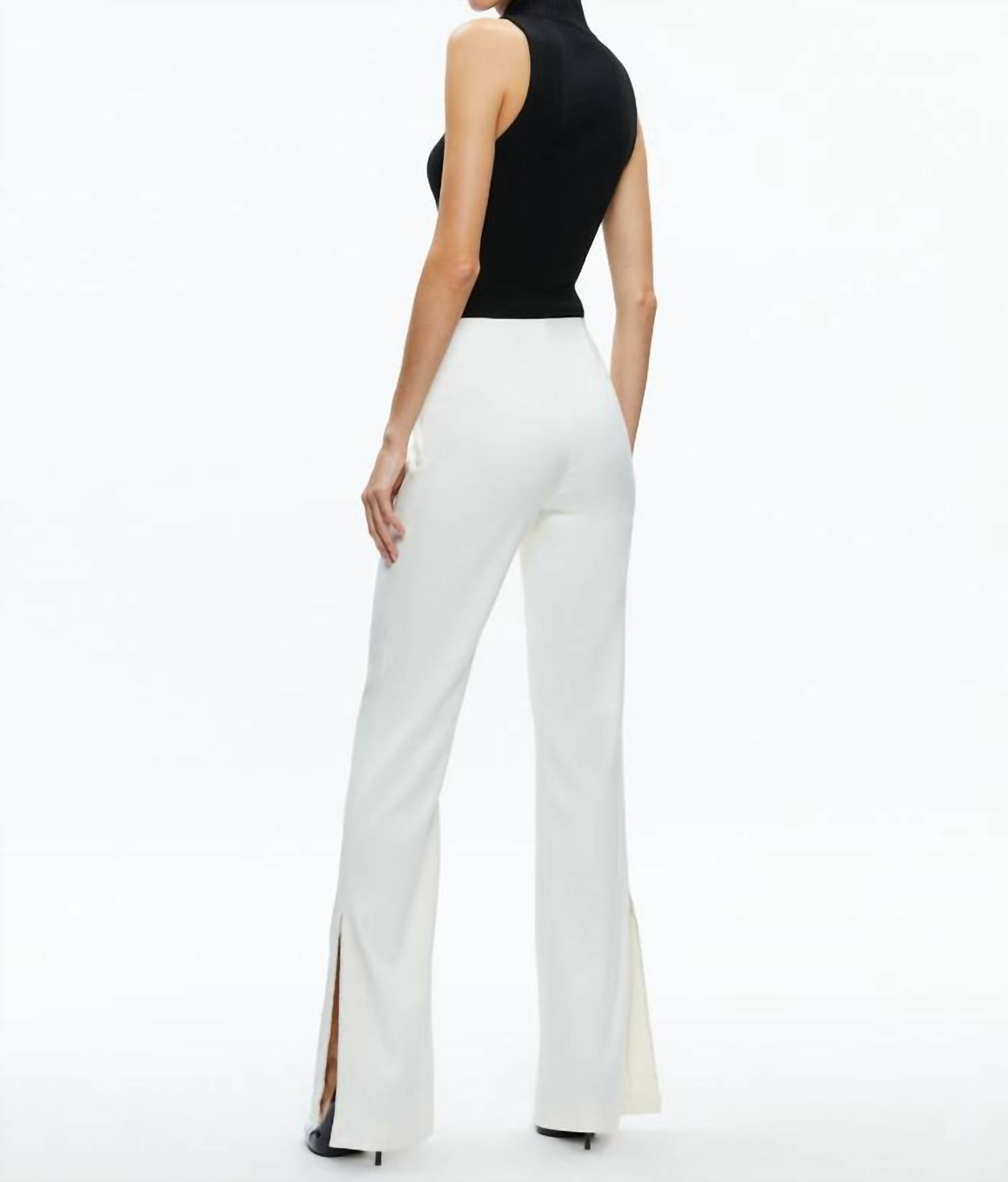 The trend report says boot-cut is in and that's exactly why we love this style. They are fit to perfection, flattering on any body type, and comfortable. They will be your go-to all season long. Elevate your wardrobe with the Lara Mid Rise Side Stripe Slit Pant by alice + olivia, perfect for a chic summer vacation look. These ecru trousers boast a solid pattern with a flared leg design, featuring a side slit adorned with an embellished trim for a touch of elegance. Crafted from a luxurious twill sateen, the blend includes 64% polyester, 32% viscose, and 4% elastane, ensuring both comfort and style. Closure: Side zipper. Care: Dry clean only. Imported.