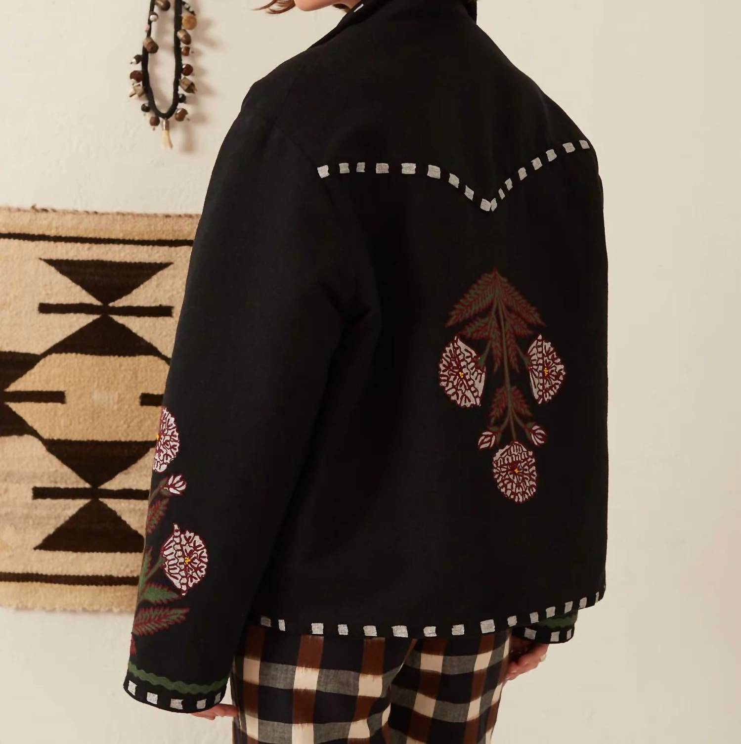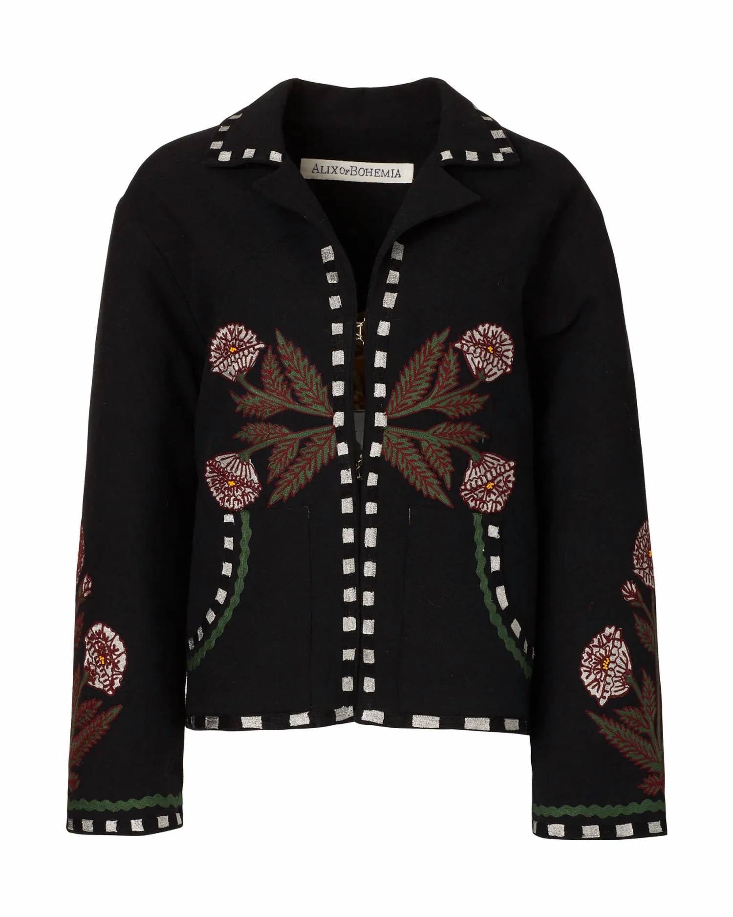 A jacket so versatile you can literally wear it with anything. Introducing the Western Bloom Jacket by ALIX OF BOHEMIA, a stunning fusion of Western flair and artisanal craftsmanship. This jacket features long sleeves and is crafted from 100% Indian slubbed silk, offering a luxurious feel and an easy, relaxed fit. Made in India, it is hand-beaded and hand-embroidered with a symmetrical floral motif and delicate beads, showcasing the unique beauty and signature of the artisan’s hand. Care: Professional dry clean only.