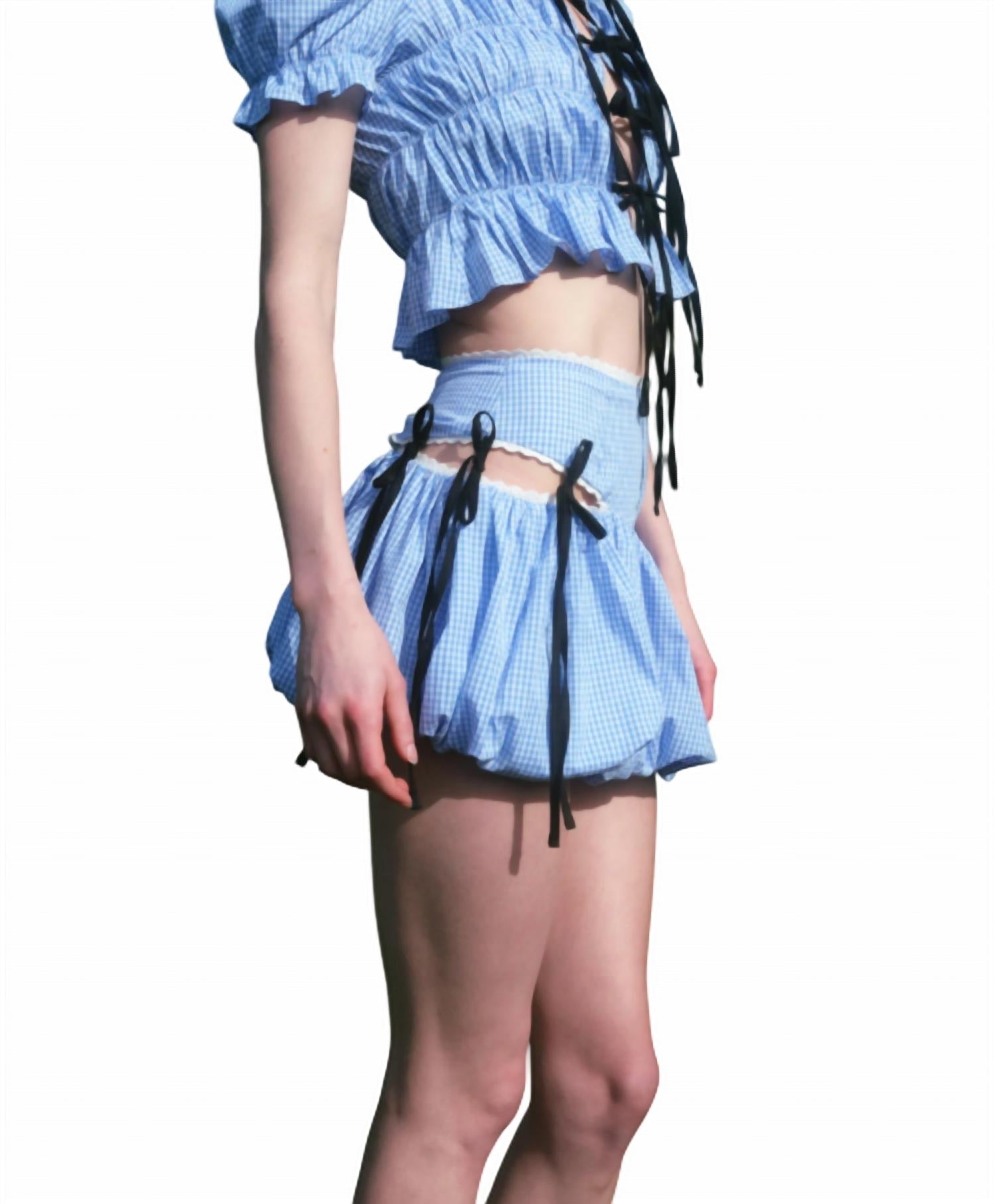 Discover the Women's Clover Skirt by Allina Liu, a trendsetting piece in a striking check pattern. Crafted from 100% cotton for both the exterior and interior, this blue asymmetrical mini skirt is fully lined and features a bubble hem for added flair. Designed with a chic cutout and contrast ties at the left side, its sleek silhouette is completed with an invisible side seam zipper. Care for this stunning garment by gently hand washing or opting for dry cleaning, and simply steam to release any wrinkles. Emme is 5'11" and wears a size XXS, boasting no stretch but fitting true to size.