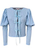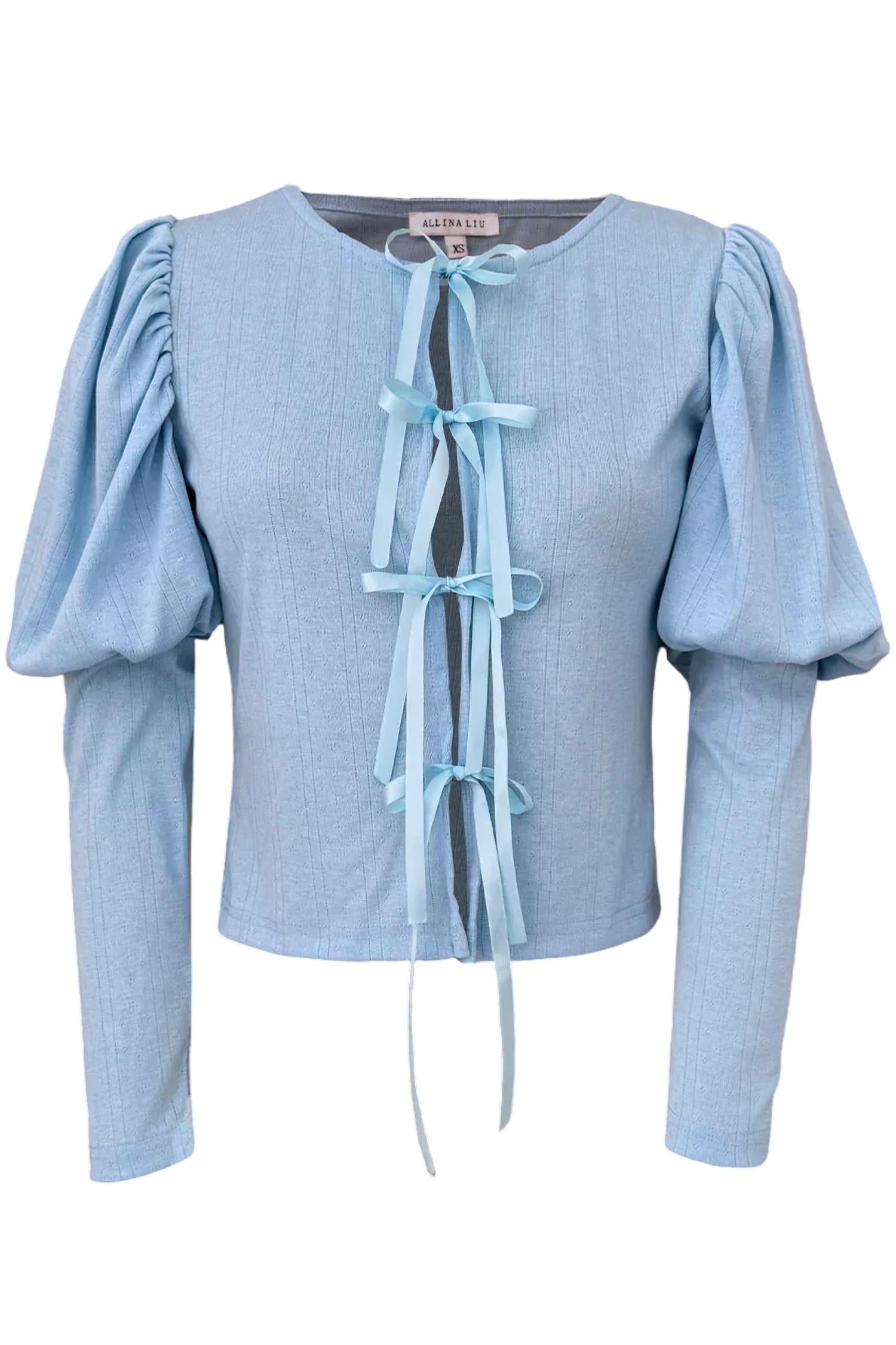Introducing the Women's Mitski Pointelle Cardigan by Allina Liu. This elegant piece in a solid ice hue features long leg-of-mutton sleeves and a crewneck design with cutout and ribbon ties at the center, complemented by a chic button closure. Crafted from 100% cotton, this cardigan is perfect for preppy holiday parties. Care requires hand washing or dry cleaning, with flat drying to maintain its shape.