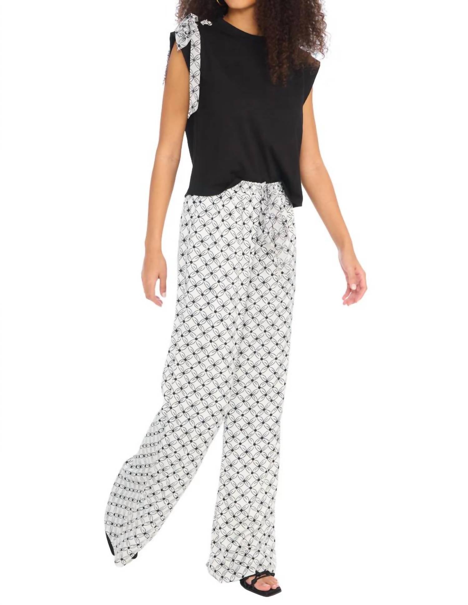 Our Tees are anything but basic and the Arlo is no exception. Designed with a strong shoulder for a boxy fit and adorned with a soft chiffon tie in our Grecian Tiles print. The armhole features an insert godet for added coverage. Cut in a medium weight jersey cotton fabrication. Pairs perfectly with the coordinating Selena Pants.