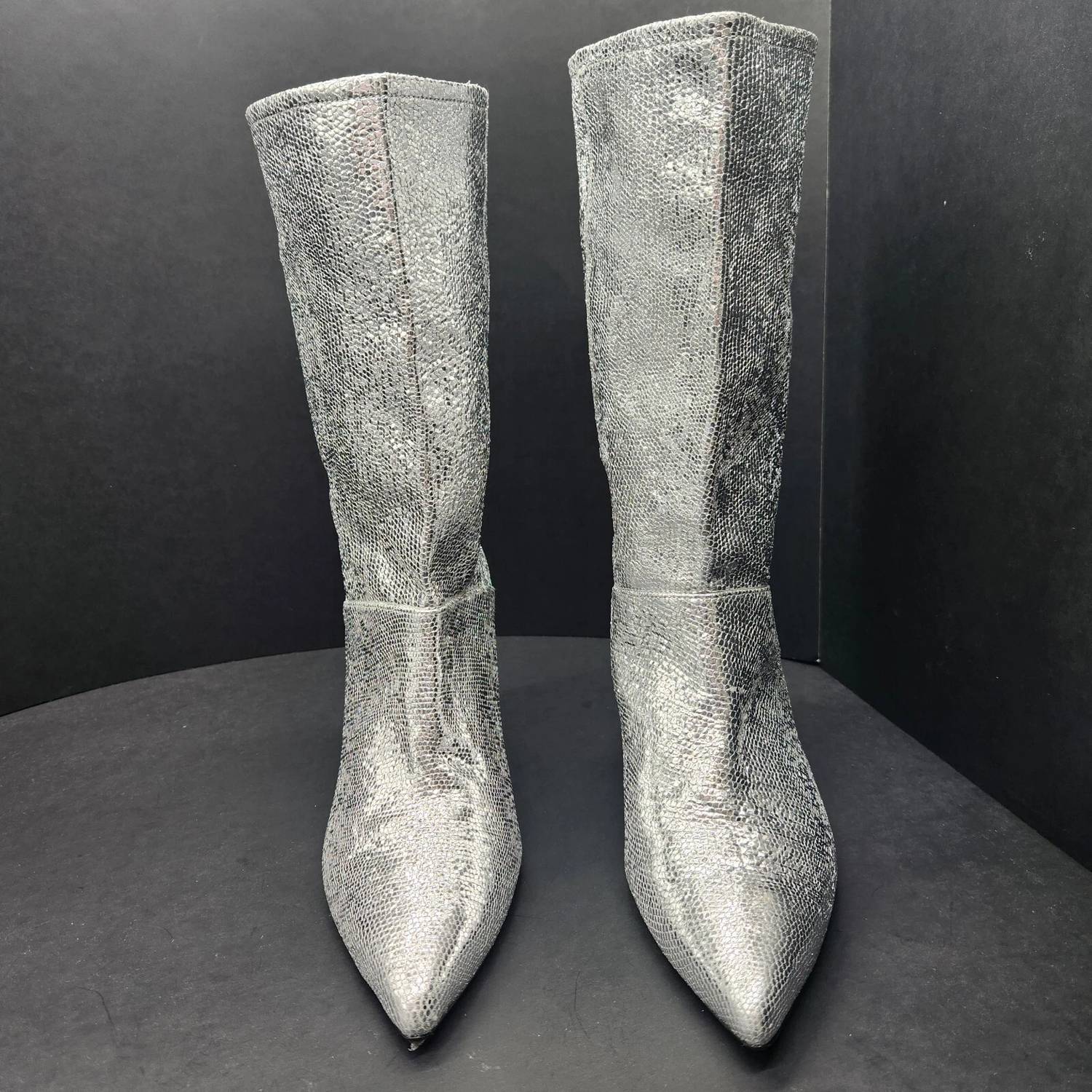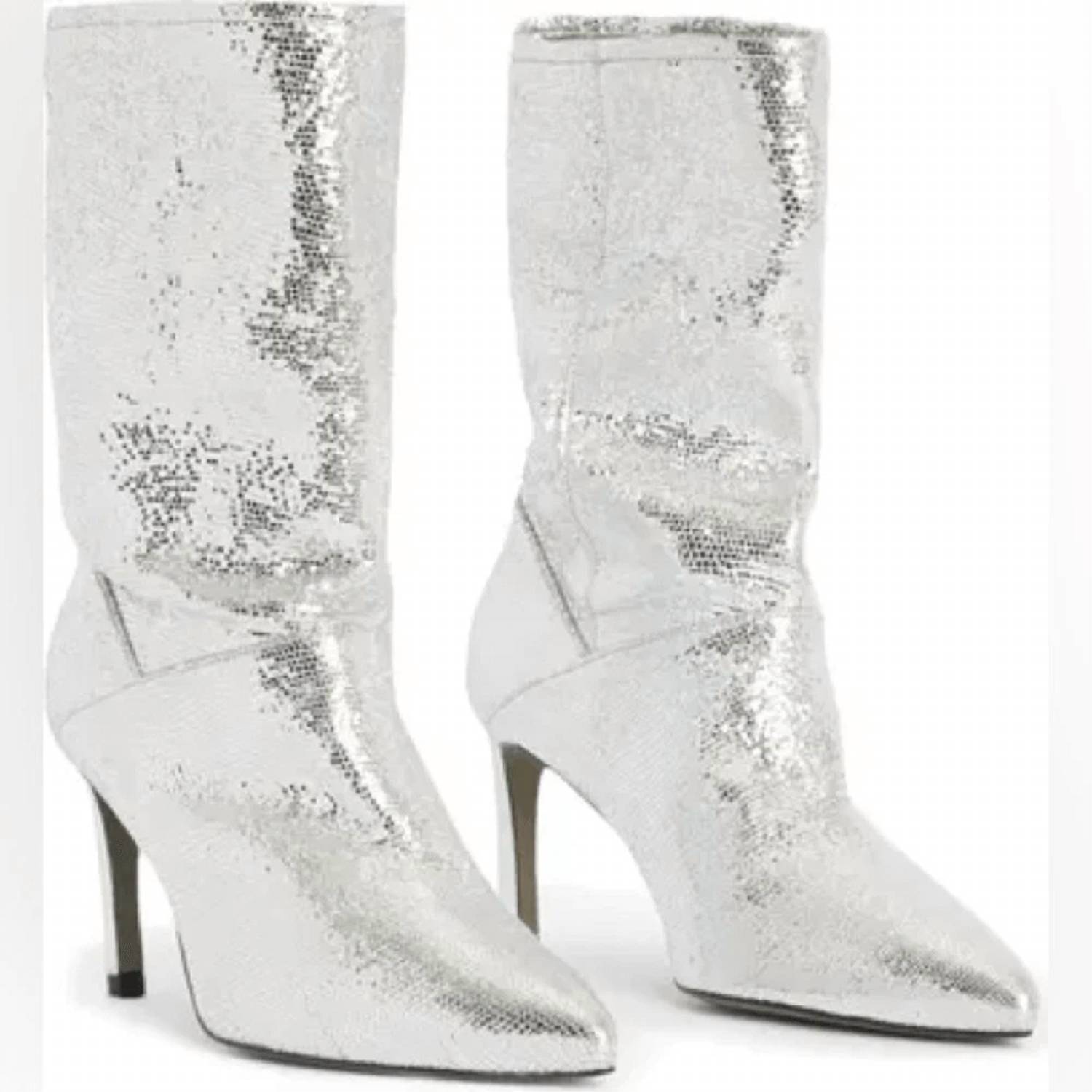 Step out in confidence and showcase your impeccable taste with these fashionable and versatile boots. Their classic style will have you reaching for these boots season after season. Step out in style with the Orlana Leather Shimmer Boots by AllSaints, a sophisticated choice for any occasion. These heeled boots feature a sleek silver design with a pointed toe, perfect for elevating any outfit. Crafted specifically for women, they offer a chic and modern look. Originating from an unspecified country, these boots promise unmatched quality and style.