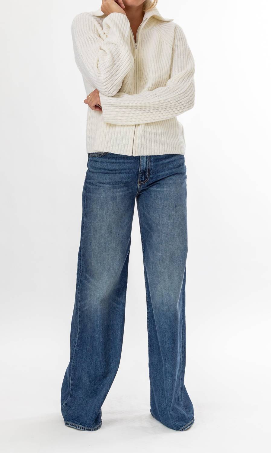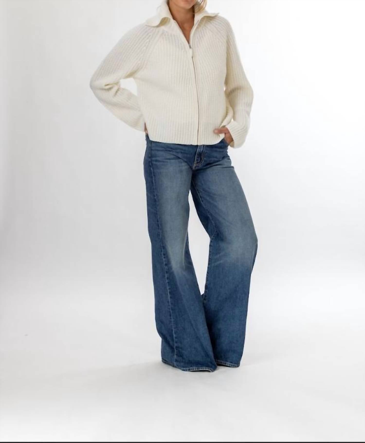This cardigan will be a sweater-rotation favorite. Introducing the Allude Zip Cardigan in the sophisticated Fleur de Sel hue, a perfect choice for winter elegance. This women's cardigan boasts long sleeves and is crafted from a luxurious blend of 70% wool and 30% cashmere, featuring a fisherman rib knit texture. Designed with a zip closure and a fold-over collar, it offers both style and warmth, ideal for minimalist and holiday occasions. Care instructions are unspecified, enhancing its understated appeal.