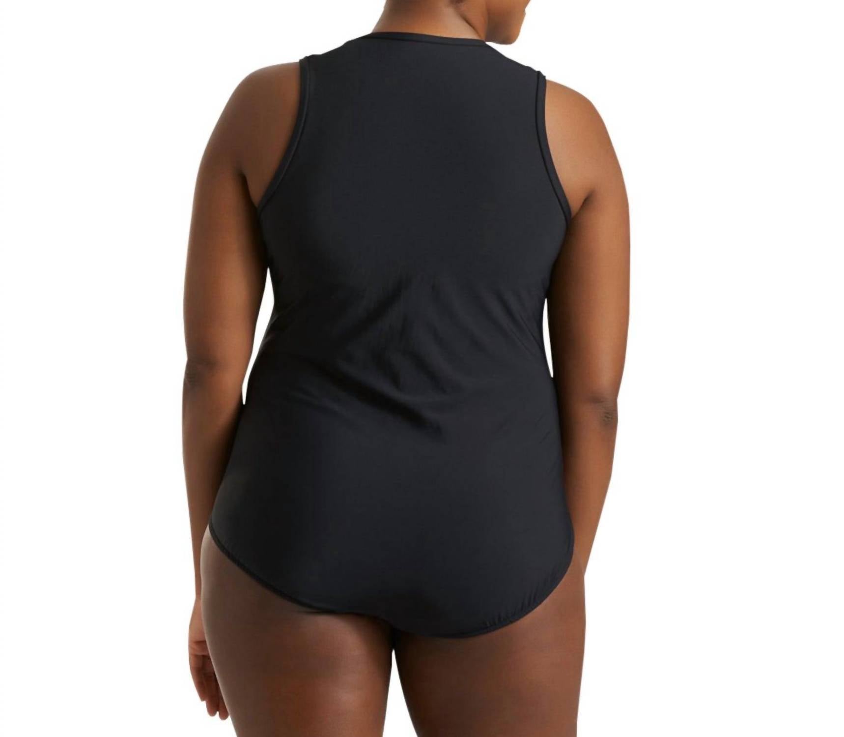 This one piece fits like a glove and covers all the right areas.This plus size swimsuit features a front panel and solid black sides and back. Full front power net slimming side panels with graphic print gold zipper detail made in the USA. fabric content: 82% nylon, 18% spandex.