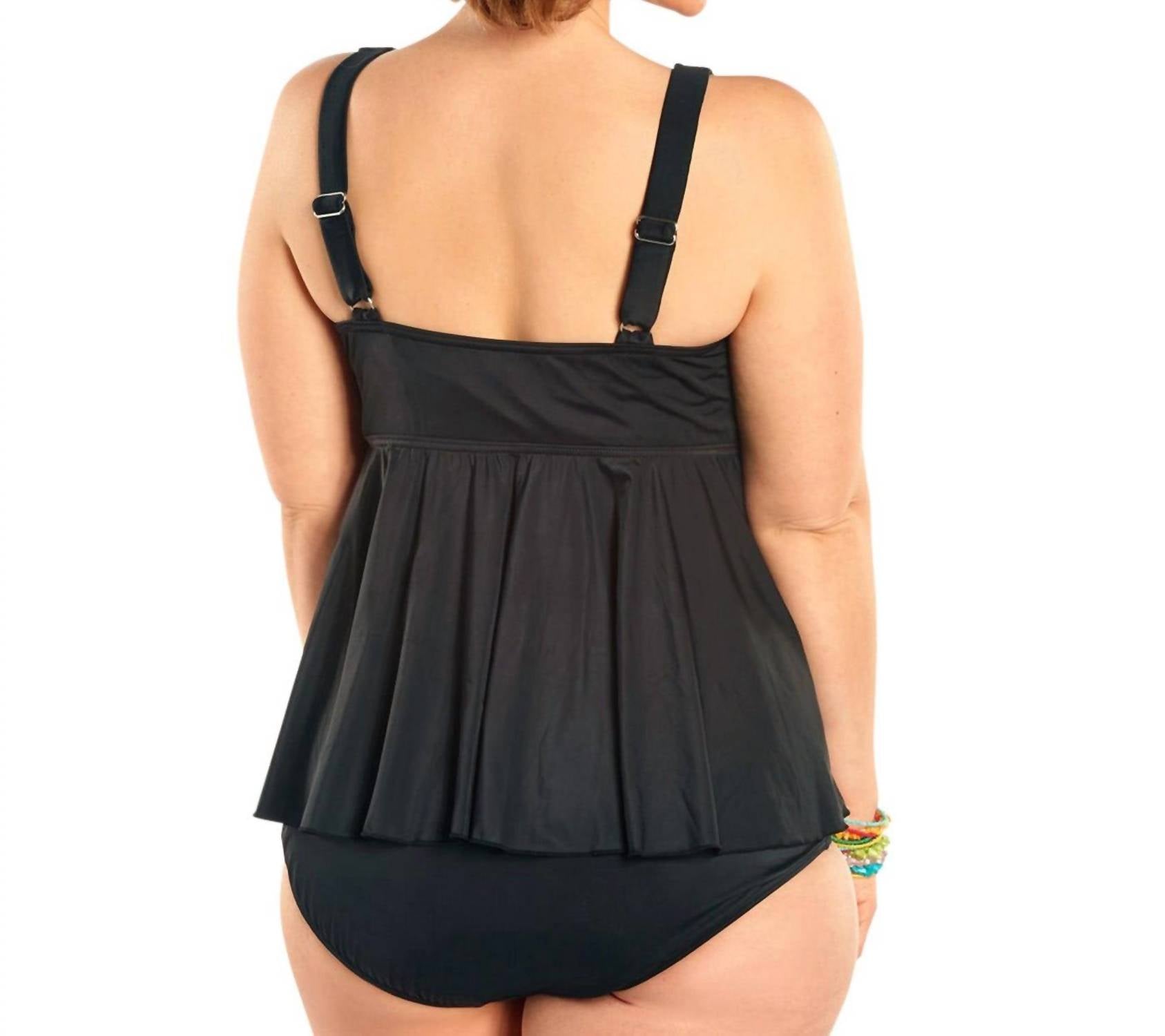 This cute and flattering swimsuit is perfect for making a splash at the pool, lounging on sun-kissed beaches, and staying stylish throughout the upcoming summer season.This is the little black tankini that every plus size woman should own, as it has the capacity to work wonders with just about every body type. The top features a V-neckline and adjustable Straps. The Tankini bottom features a full coverage for comfortable wear.