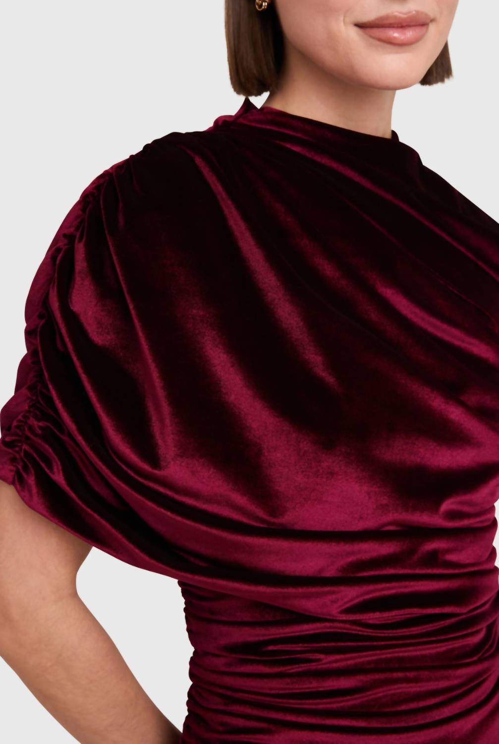A versatile blouse that works from desk to dinner! The Amanda Uprichard Evianna Top is an elegant choice in rich burgundy, tailored for stylish occasions. This short sleeve top offers a sophisticated mockneck design crafted from ruched velvet, ensuring a textured finish that stands out. Made from 93% polyester and 7% spandex, it features a hidden back zipper closure, reflecting quality craftsmanship from China. For optimal maintenance, it's recommended to dry clean only.