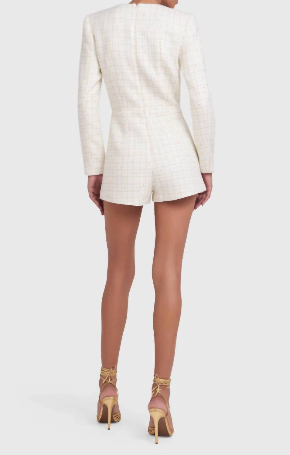 Throw it on and go! Experience modern luxury with the Fallon Romper by Amanda Uprichard, an astute blend of timeless tweed and contemporary flair in a striking white and gold textured design. This romper features long sleeves and polished gold novelty buttons, ensuring bold sophistication. Crafted with a premium blend of 50% Polyester, 35% Acrylic, and 15% Wool, it is lined with 92% Polyester and 8% Elastane. Closure is achieved through an elegant button fastening, and it is recommended to dry clean only to preserve its quality.