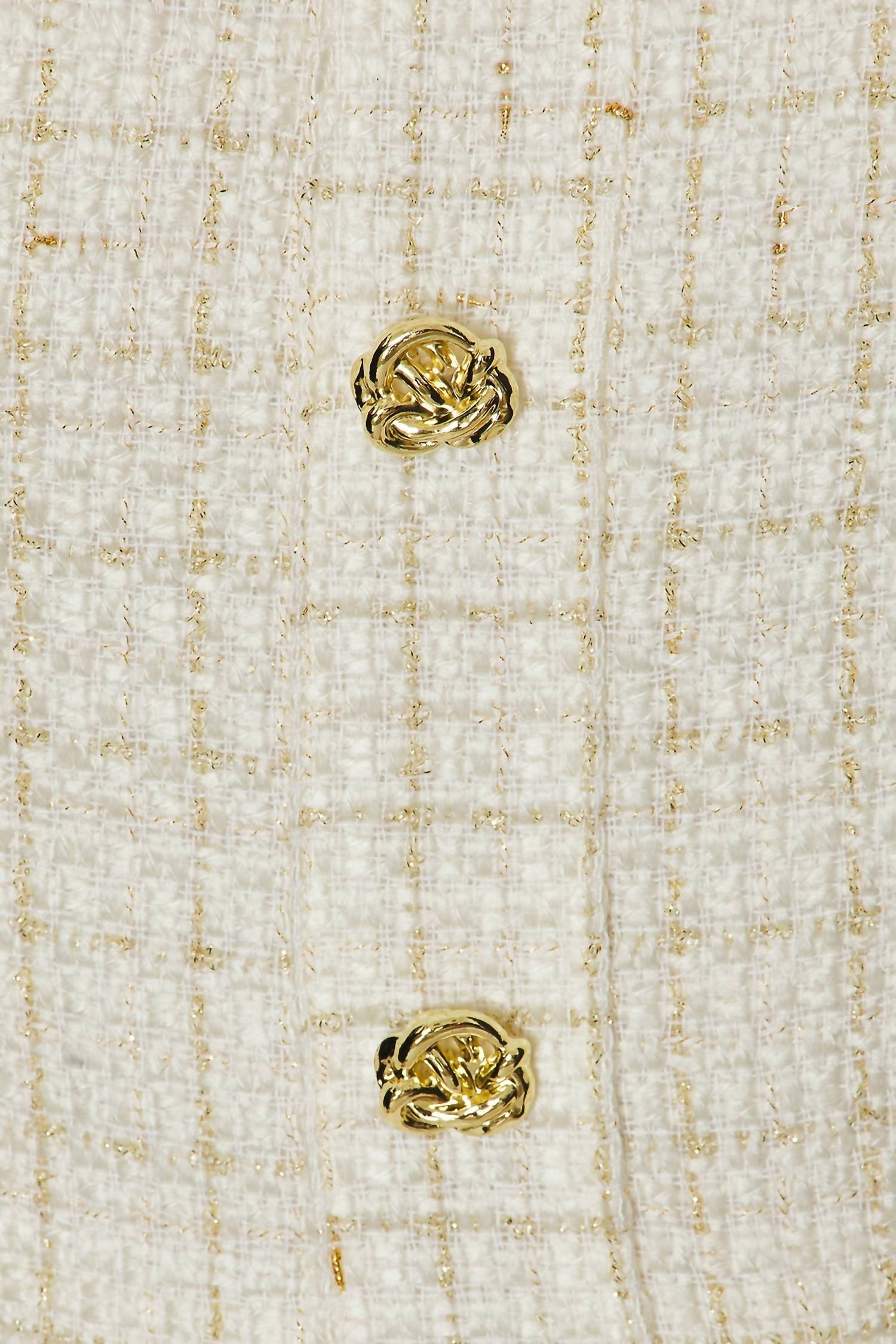 Throw it on and go! Introducing the Fallon Romper by Amanda Uprichard, crafted for a chic holiday party look. This romper features a zip closure and is made from a luxurious blend of 50% polyester, 35% acrylic, and 15% wool, offering both comfort and sophistication. The golden buttons and snowy wool-kissed tweed bring a touch of elegance, perfectly complementing its tailored aesthetic with shapely seams. Care for this minimalist piece with a dry clean to maintain its festive elegance.