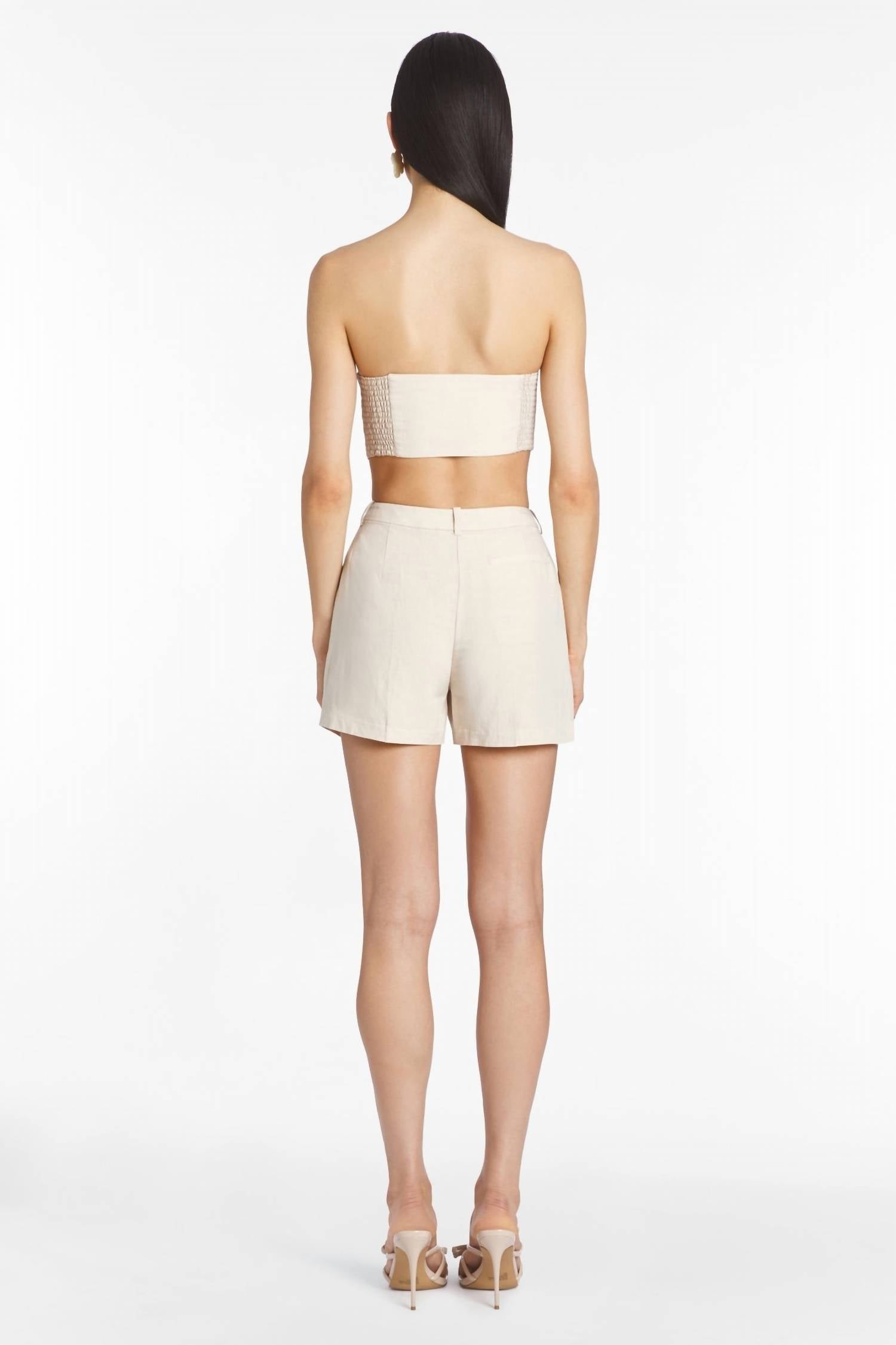Pair this crop top with your favorite high-waisted jeans or maxi skirt. Elevate your summer wardrobe with the Lucien Top by Amanda Uprichard, an elegant off-the-shoulder piece in a solid beige hue. This strapless, crop top blends luxurious materials with its self made from 100% Linen and lining crafted from 100% Polyester, accented by novelty mother of pearl buttons. Designed for women looking to make a statement at cocktail parties or special occasions like Valentine's Day, it exemplifies the Y2K trend. Care: Dry clean only.