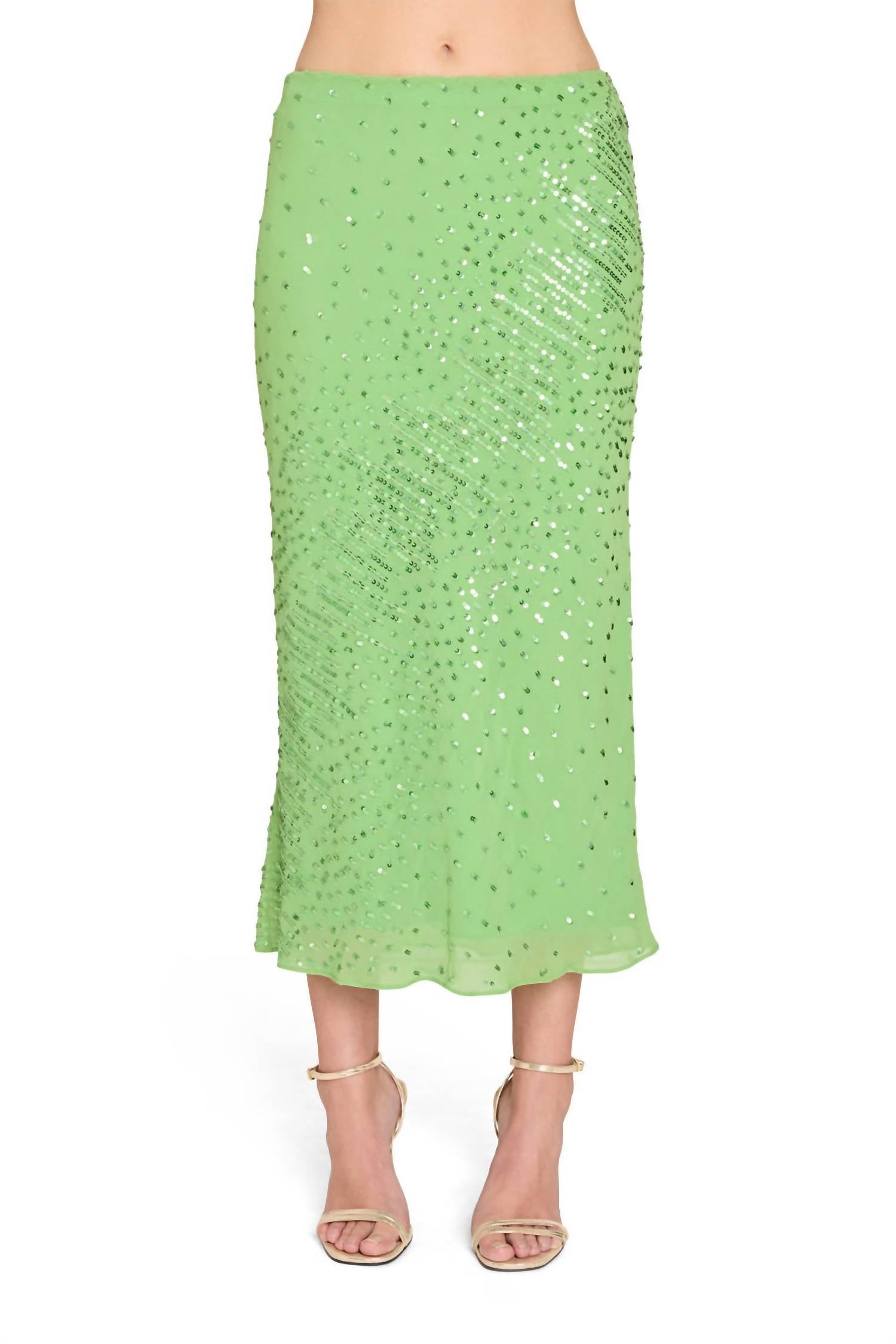 Tuck your favorite tee into this midi length skirt for an effortlessly cool look. Make a statement with the Noella Sequin Chiffon Bias Skirt by Amanda Uprichard, a stunning piece in vibrant green. This women's maxi skirt features an elastic waist and is fully lined, crafted from 100% rayon for a sophisticated, textured look. With its sequin embellishments, it adds an eye-catching sparkle perfect for evening events. Closure: Pull-on style. Care: Dry clean recommended.