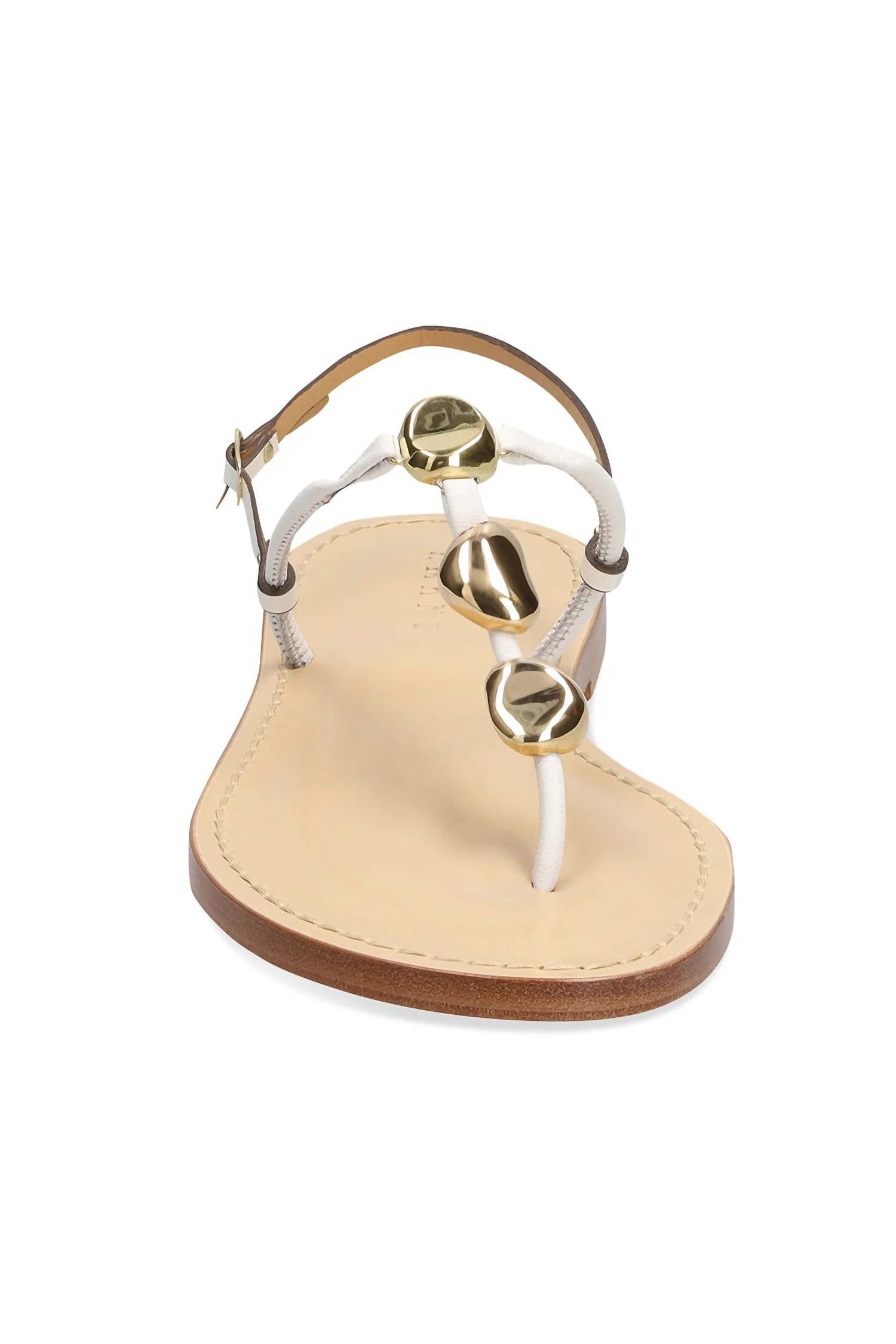 This sandal will take you from brunch to dinner and everything in between. Introducing the Women's Nairobi Leather Sandals by AMANU, crafted for the modern woman seeking elegance and versatility. These white sandals, featuring a sleek T-strap design, are perfect for seamlessly transitioning from casual days to polished evenings. Made from premium leather with organic gold-tone hardware, these sandals are handcrafted in Italy. With a medium shoe width, open toe shape, and flat heel under 1 inch, they are ideal for summer and workwear occasions, including holiday parties like the 4th of July.