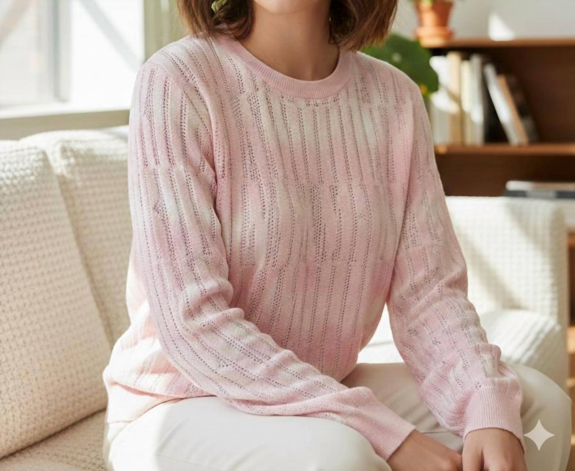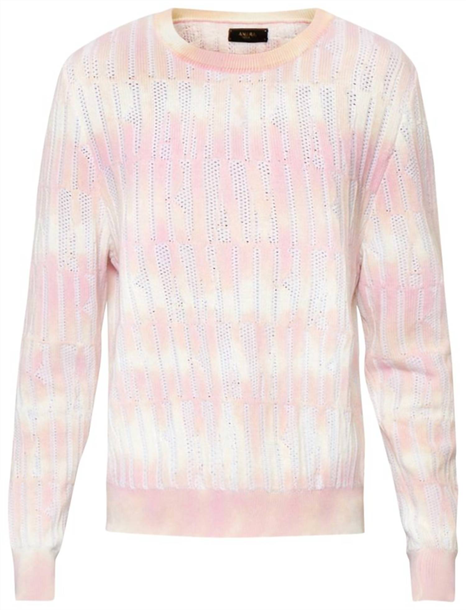 Introducing the Destroy And Repair Crew Sweater by Amiri, a minimalist statement piece perfect for fall travels. This women's crewneck sweater comes in a textured pink pattern with long sleeves and a comfortable pull-on design. Crafted from a luxurious blend of 68% cotton, 20% polyester, and 12% cashmere, its soft cotton blend ensures warmth and style during chilly weather. Maintenance is easy with dry clean care instructions.