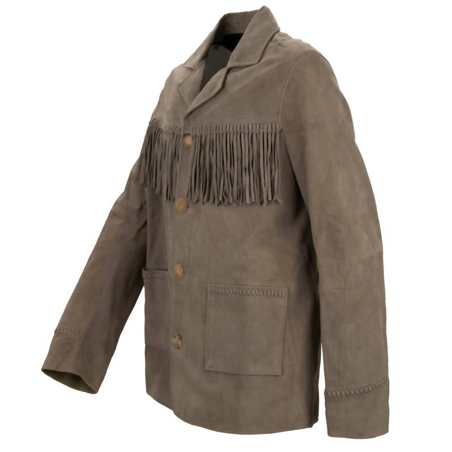 Introducing the Men's Fringe Suede Jacket by Amiri, a must-have for your fall wardrobe in a sophisticated grey hue. This lightweight jacket features long sleeves and a collar, crafted from 100% lamb leather for a luxurious feel. Made in Italy, it boasts a button closure for a sleek and stylish silhouette. Designed for vacation wear, this solid monochrome piece is perfect for a standout Thanksgiving look.