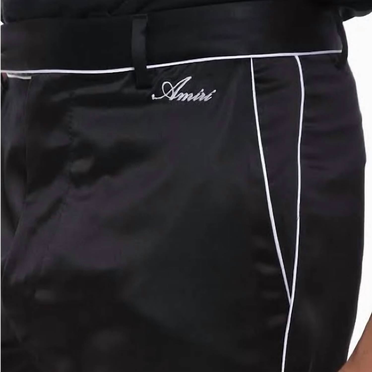 Introducing the Women's PJ Straight Leg Tailored Pants by Amiri, crafted for modern elegance in solid black. These regular fit pants are made from 100% viscose, providing a luxurious feel and drape. Featuring a high-rise waist and a practical zip closure, they complement any travel wardrobe, ideal for streetwear trends. With pockets for convenience, these tailored pants require hand washing and should be line dried to maintain their quality.