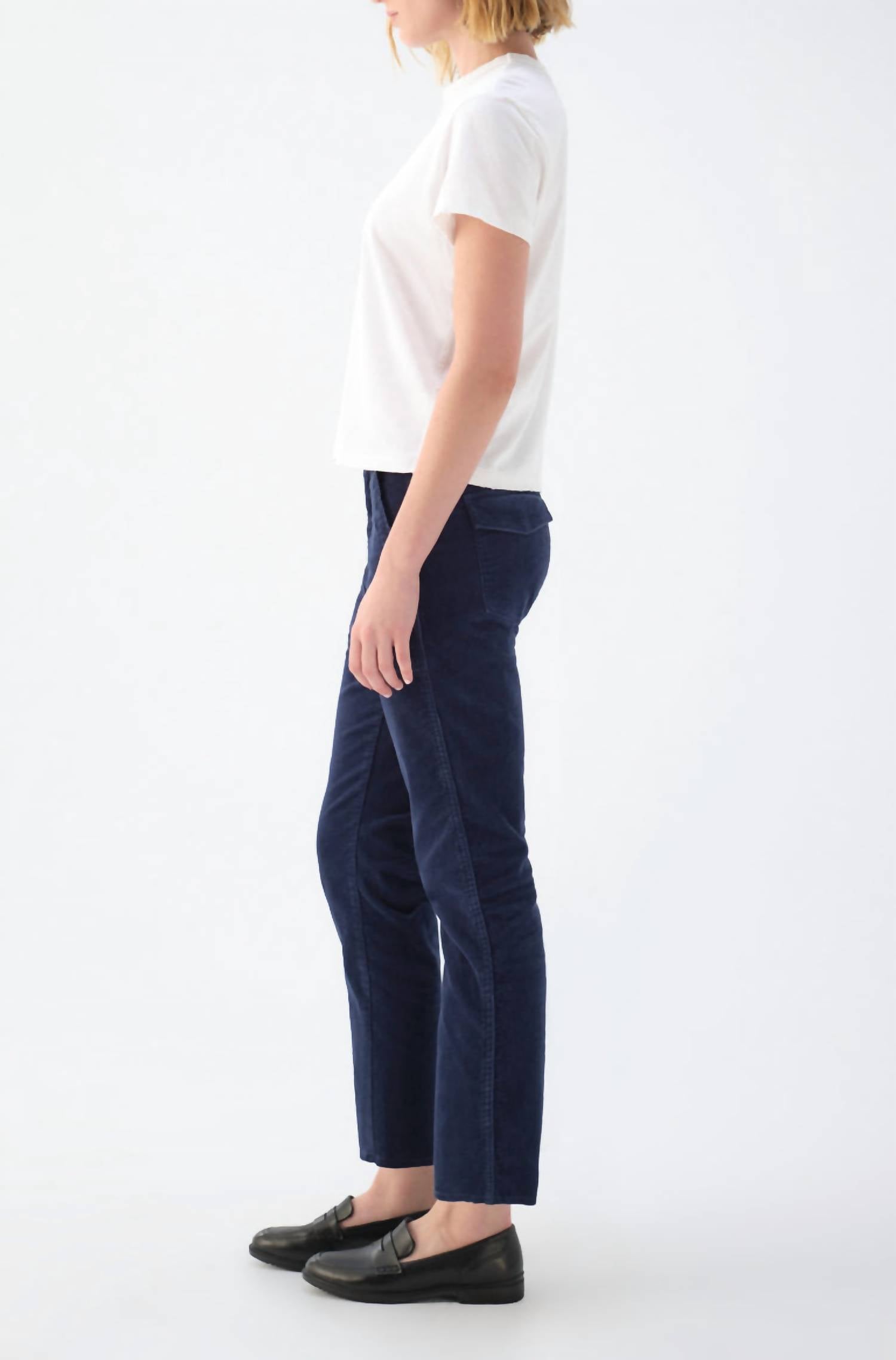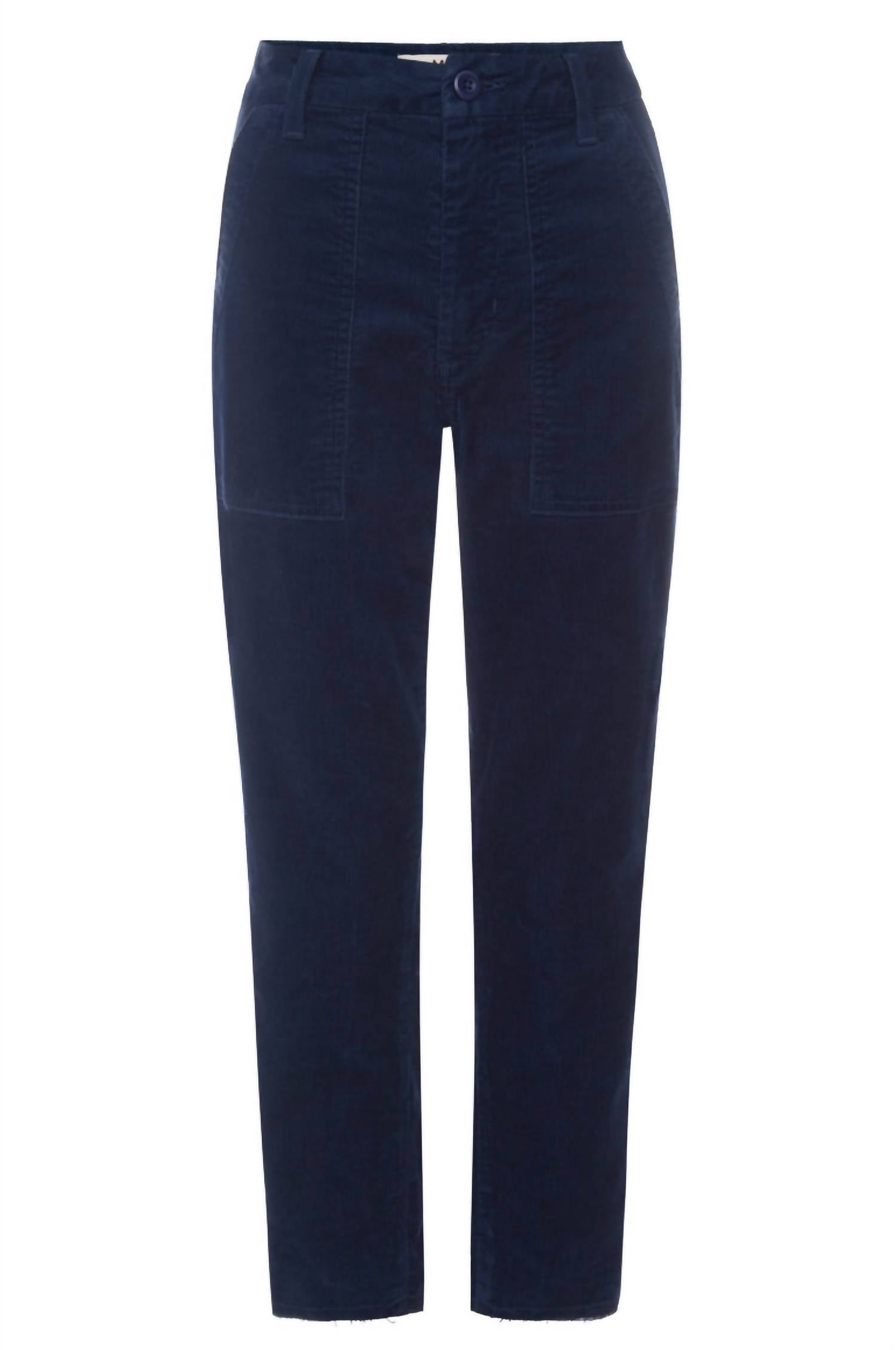 We especially love this cropped jean with a cute pair of slides or sandals. Introducing the Corduroy Easy Army Trouser by AMO, crafted in a cotton blend for effortless summer style. These women's trousers feature a mid-rise with a straight leg ankle length, highlighted by an inseam of 25.5 inches and a rise of 11.5 inches. Made in the US, these trousers offer convenient button closure and army patch-style pockets for a preppy vacation look. Care instructions include machine wash and tumble dry, ensuring easy upkeep.