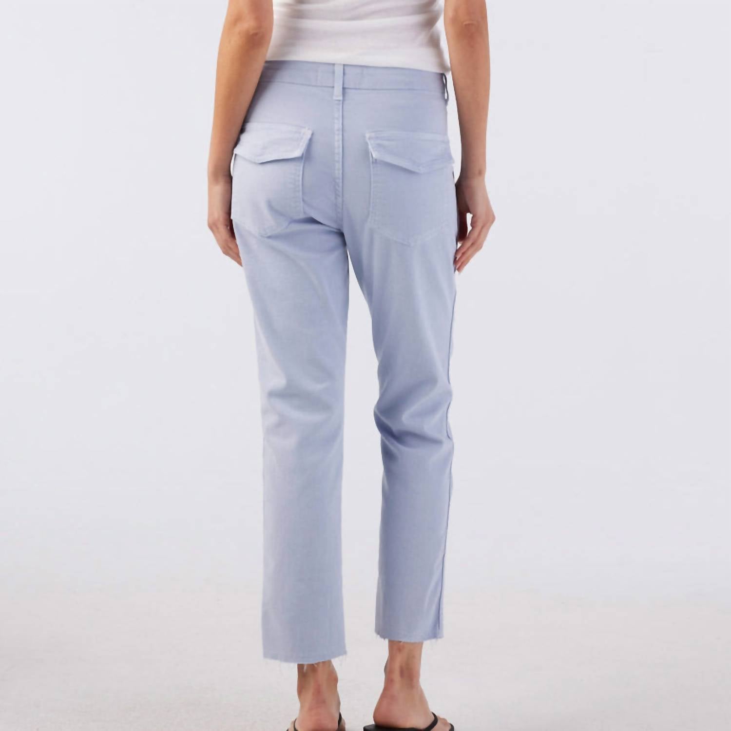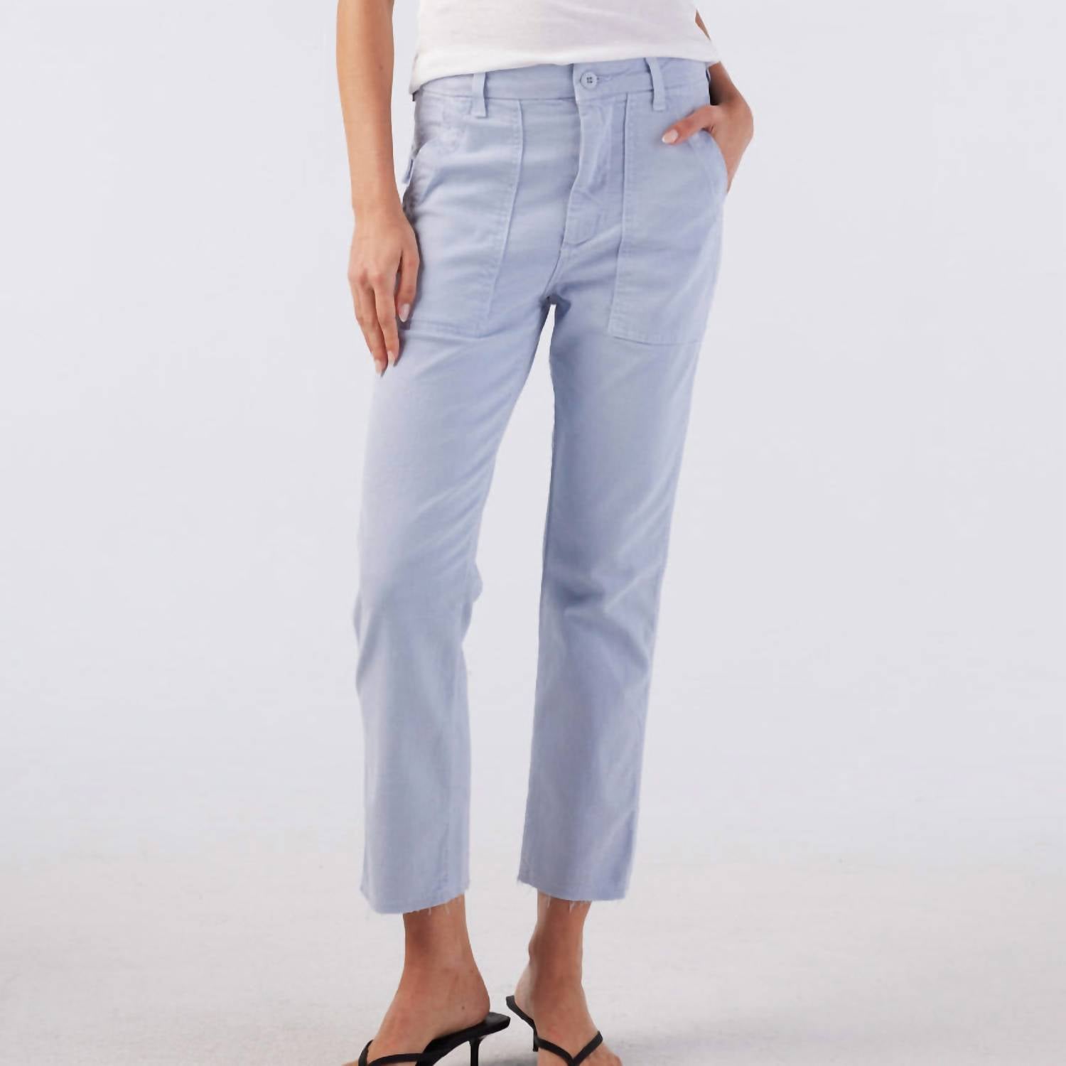 Introducing the Easy Army Trouser by AMO, a modern take on the classic army pant that perfectly blends style and comfort. Designed in a relaxed fit with a slightly dropped crotch, these trousers feature a cropped straight leg silhouette. Composition: 78% Cotton, 29% Lyocell, 1% Elastane. Closure: Zip closure. The utilitarian front and back patch-style pockets along with a raw cut hem and garment-dyed finish lend a vintage touch. Measurements: Inseam 25 1/2", Front Rise 11 1/2", Leg Opening 14 3/4", based on size 27.