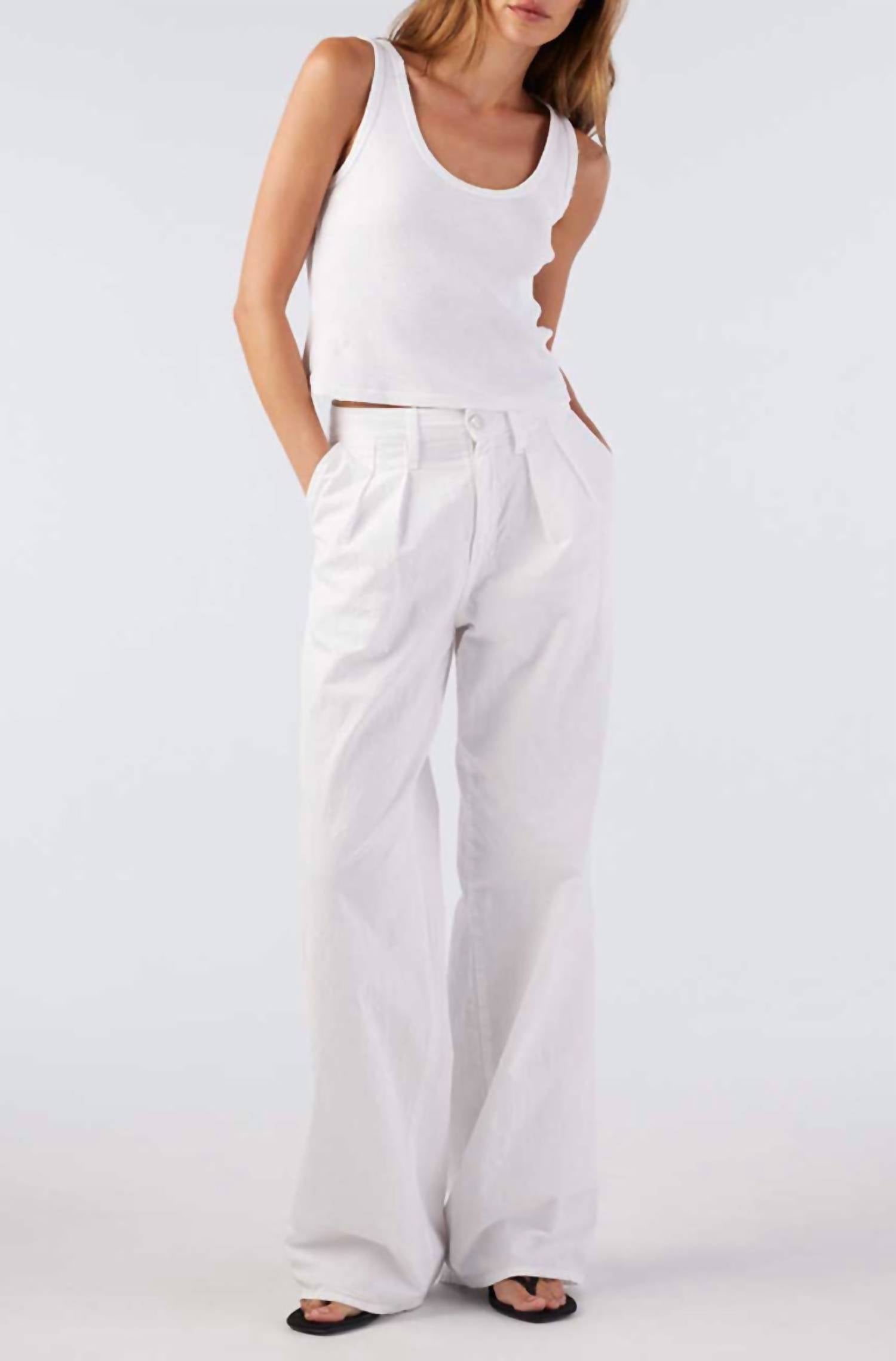 Introducing the Sheryl Trouser by AMO, a must-have addition to your spring wardrobe in timeless white. These wide-leg trousers boast a relaxed fit with flattering front pleats and quarter top pockets. Crafted from 70% cotton, 27% linen, and 3% lycra, they offer both comfort and style, featuring a 32" inseam and button closure at the waist. Made in Los Angeles, these trousers are easy to care for with machine wash cold and tumble dry instructions.