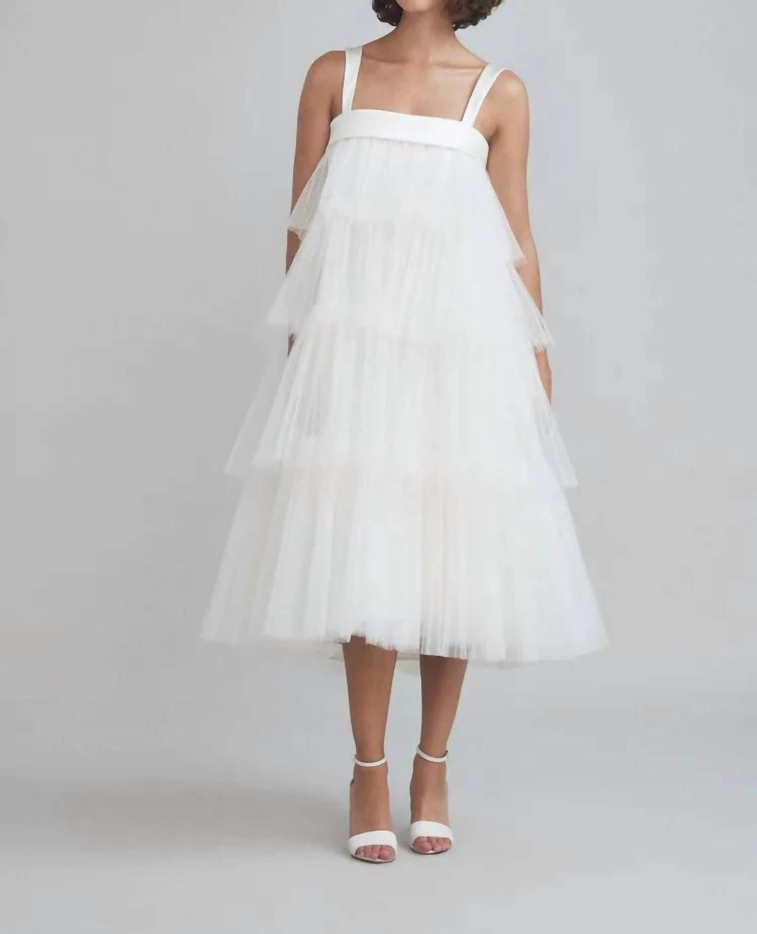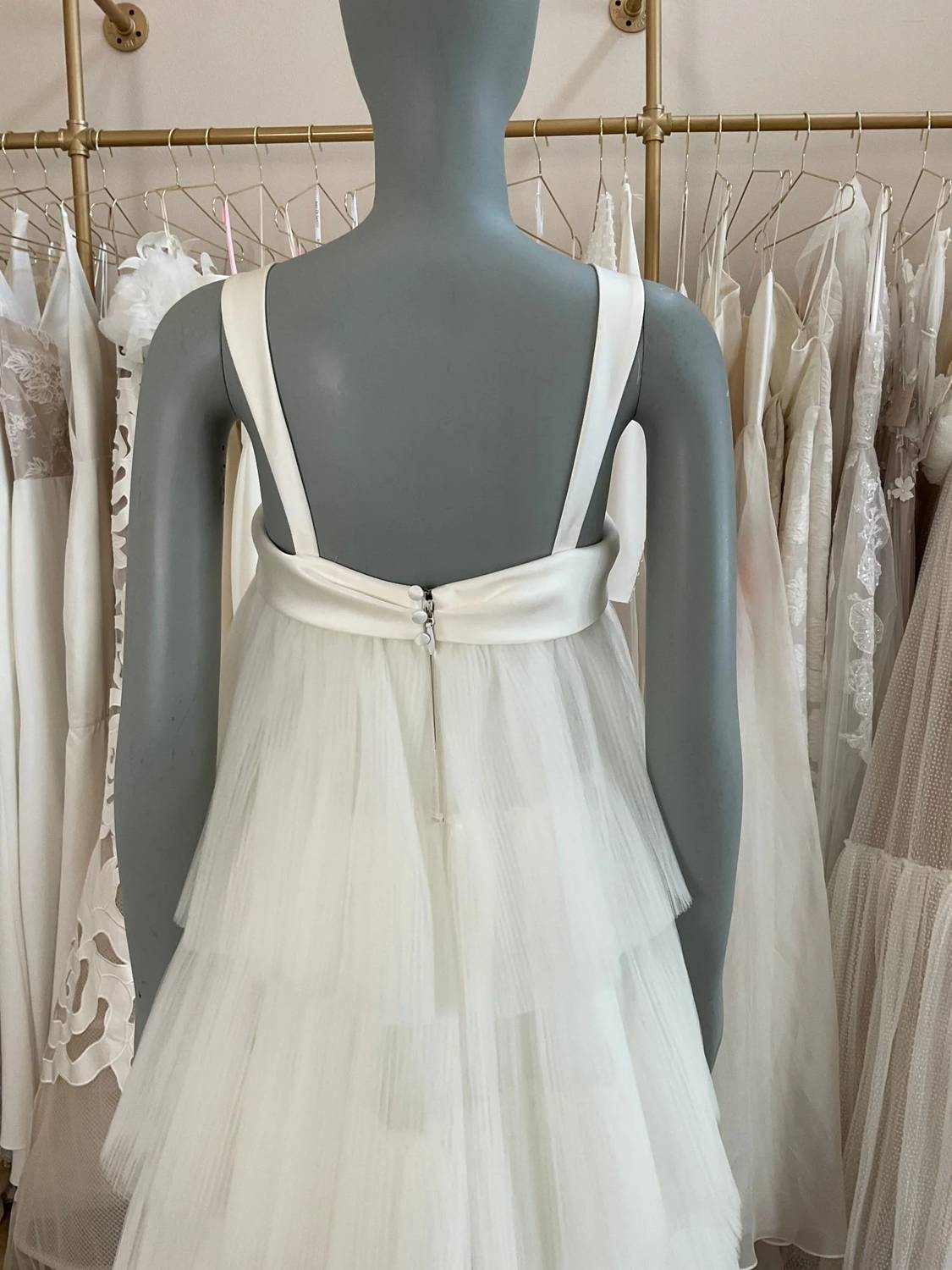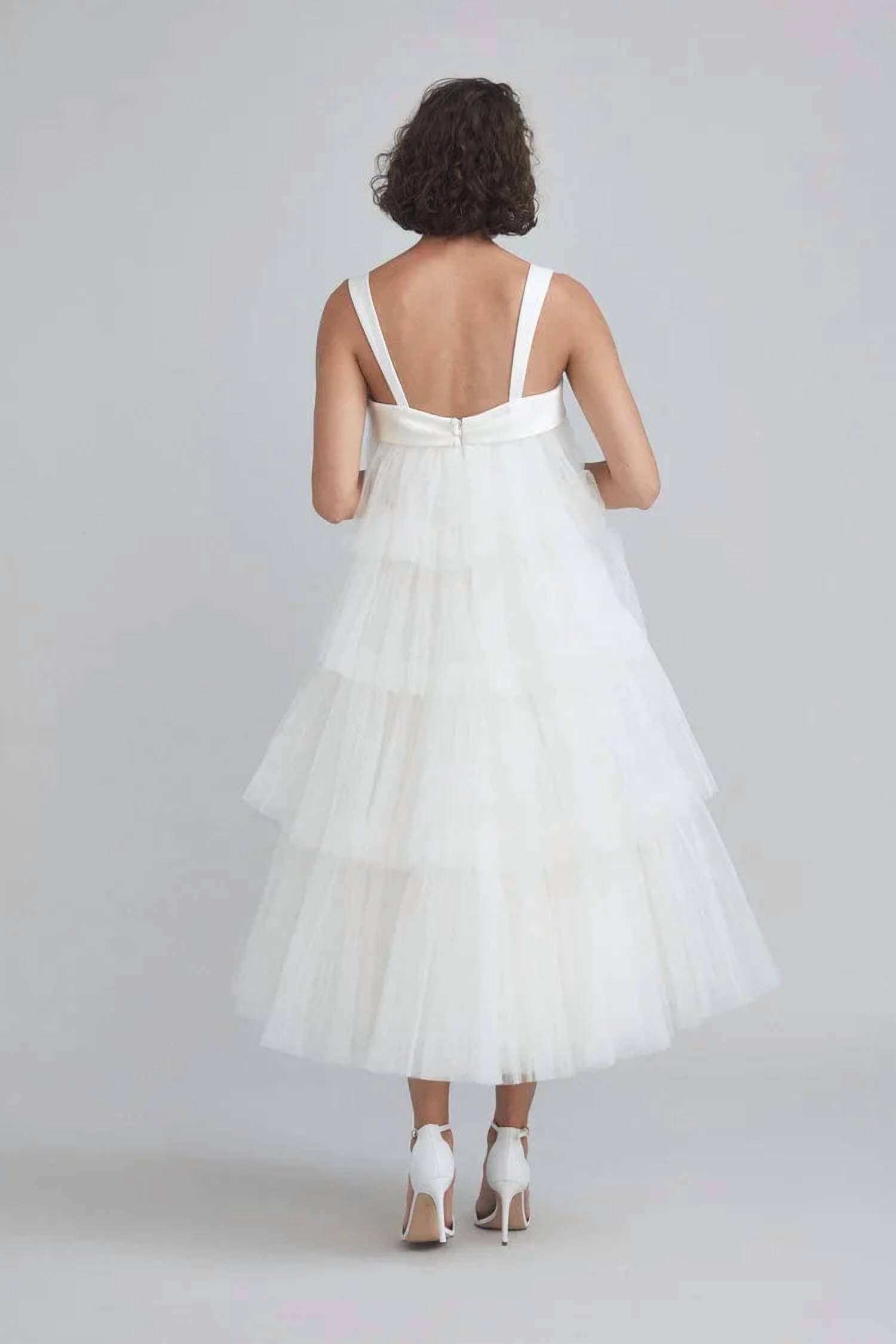 Say 'I do' in style and let your personality shine through in this elegant and timeless dress. With its classic silhouette, this is the perfect wedding dress for the stylish bride to be. Introducing the Tiered Pleated Tulle Wedding Dress by Amsale, designed to elevate your special day with a touch of elegance. This sleeveless gown boasts a square neckline and shoulder straps accentuated with satin trim, beautifully complementing the tiers of hand-pleated tulle. Further enhanced with a charming bow detail, this trapeze dress is perfect for a breathtaking wedding look. Crafted with exquisite attention to detail, this dress requires dry cleaning to maintain its pristine condition.