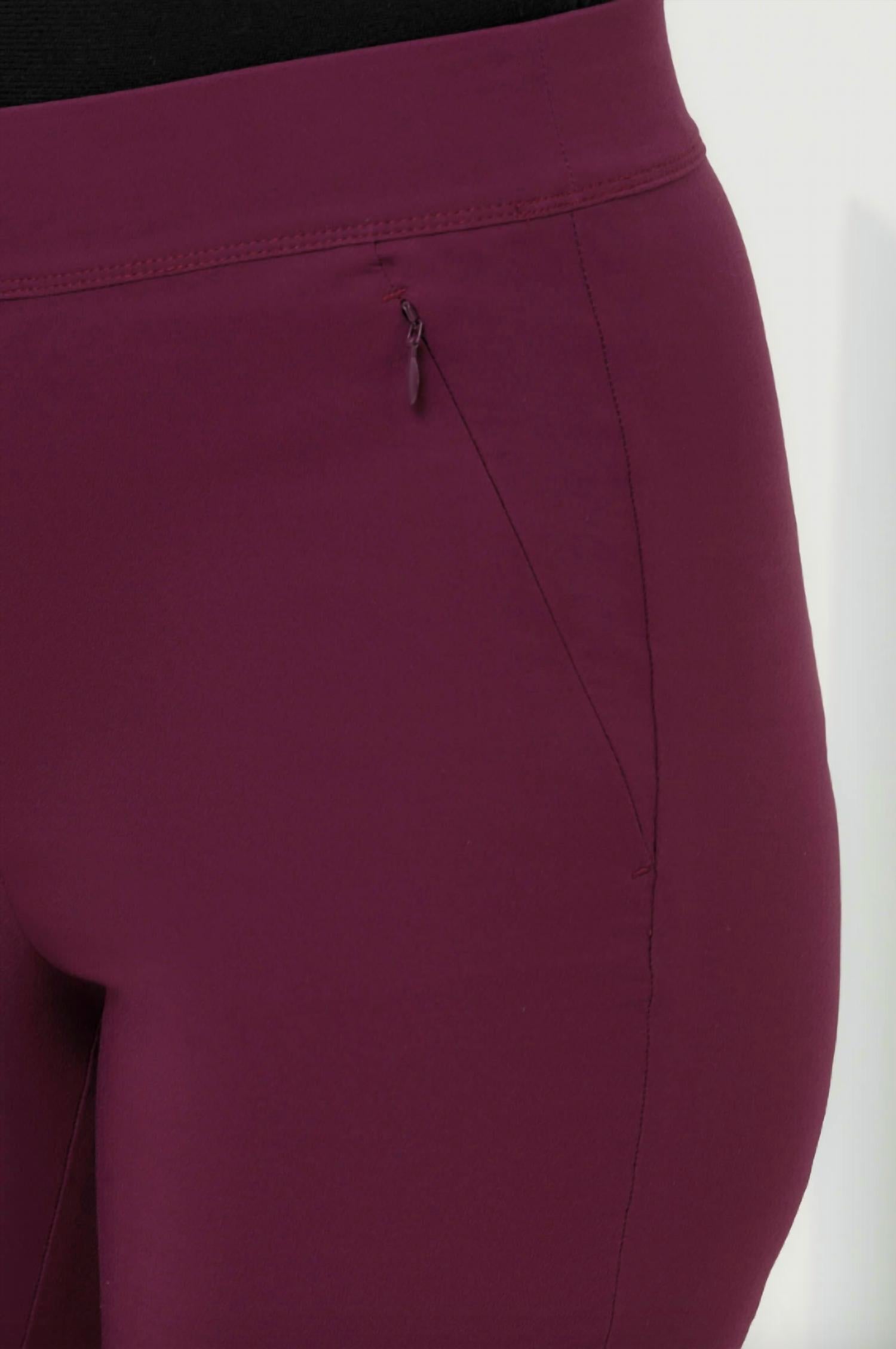 A skinny pant that is both flatering and comfortable. We love this style because it works great with boots, or without! Pull-on style with a flat front, featuring a straight leg with a hem. High-rise, relaxed fit with a 1-inch comfortable elastic waistband. Includes hidden pockets with tonal zippers at the hip and is wrinkle-resistant. 32” Inseam, 10 3/4" Front rise. 94% Polyester, 6% Elastane.