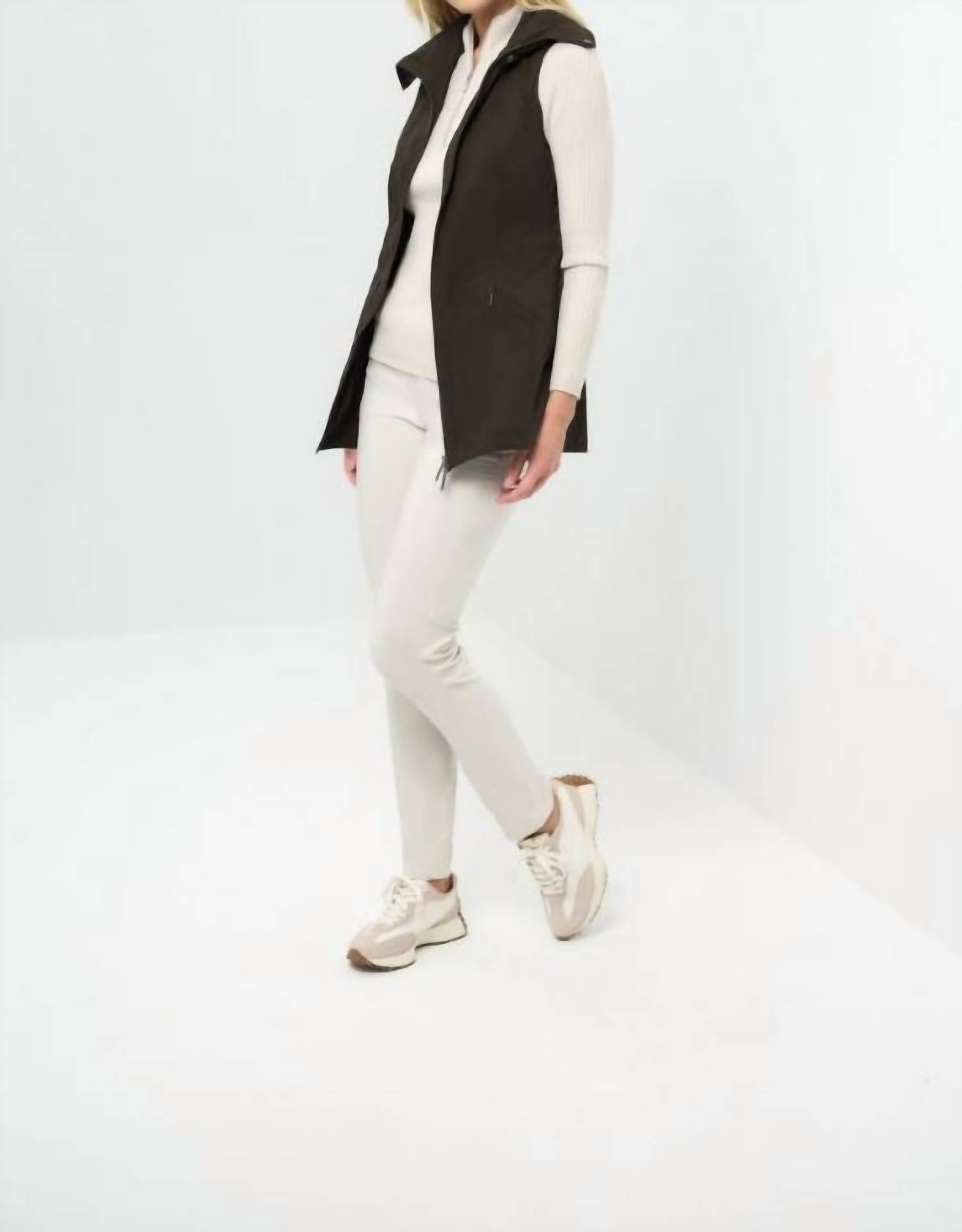 The Anatomie Women's Delaney Mid Weight Stretch Vest in Espresso is a staple for any wardrobe, combining style and functionality. This sleeveless vest, made from 94% Polyamide and 6% Elastane, is designed for a slim fit with a slight flare at the hips, perfect for layering. It features a high fold-over collar with snaps and a practical double zip closure, extending to a low hip length and embellished with antique brass trims. For care, machine wash cold with like colors, tumble dry low, cool iron, or dry clean as preferred, making it suitable for a variety of occasions, especially during spring camping adventures.