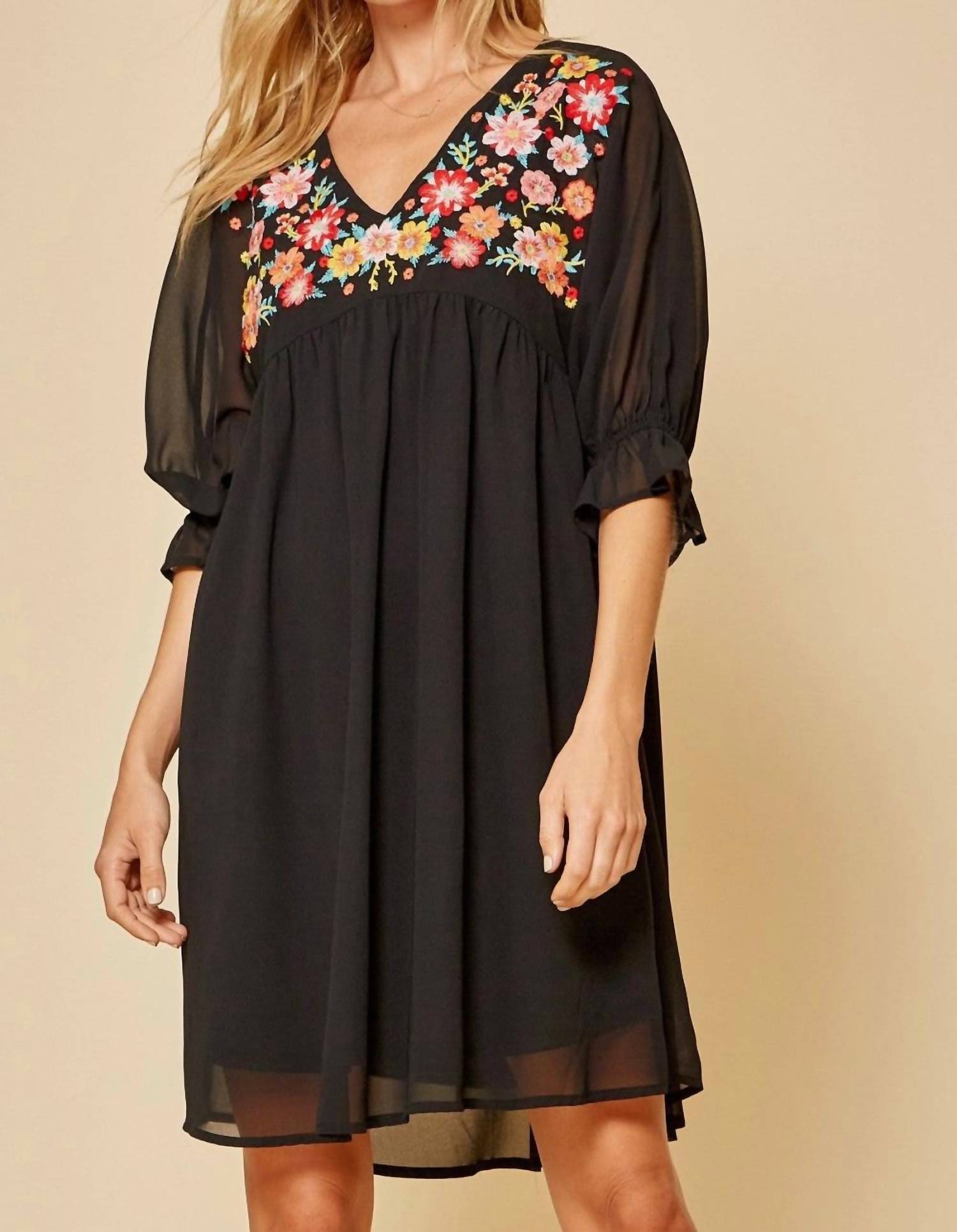 The kind of easy and flattering dress you'll be reaching for all season long. Introducing the Floral Embroidered Dress by ANDREE BY UNIT, a captivating black mini dress perfect for any occasion. This boho chic garment features elegant elbow-length sleeves with ruffles and no pockets. Made from 100% woven polyester, the dress boasts a high waist, V-neckline, and A-line silhouette with a floral pattern. Closure is pull-on, and for optimal care, hand wash cold. Available dimensions: Small Bust 38", Medium Bust 40", Large Bust 42" with a consistent length of 36".