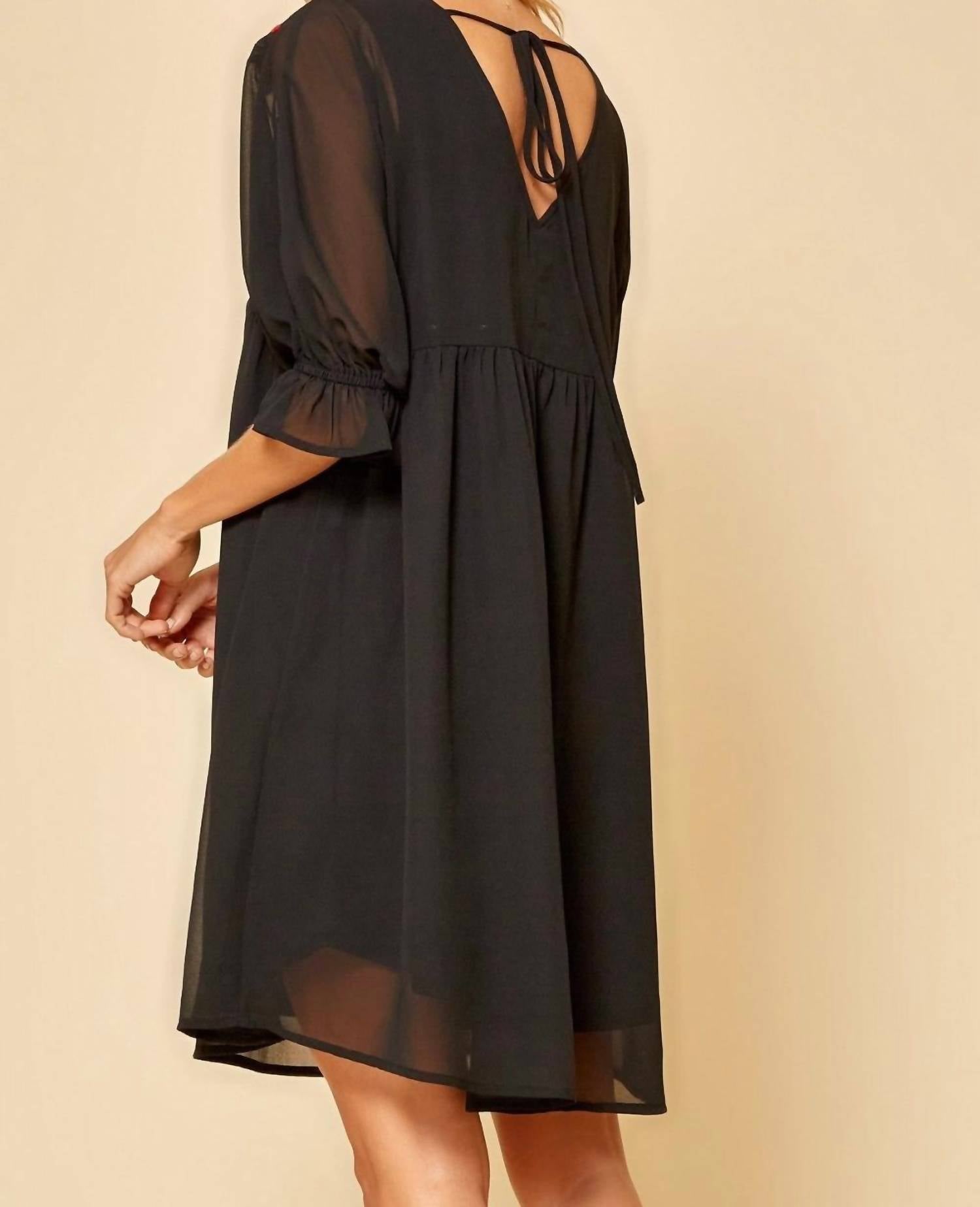 Introducing the Floral Embroidered Dress by ANDREE BY UNIT, a captivating black mini dress perfect for any occasion. This boho chic garment features elegant elbow-length sleeves with ruffles and no pockets. Made from 100% woven polyester, the dress boasts a high waist, V-neckline, and A-line silhouette with a floral pattern. Closure is pull-on, and for optimal care, hand wash cold. Available dimensions: Small Bust 38", Medium Bust 40", Large Bust 42" with a consistent length of 36".