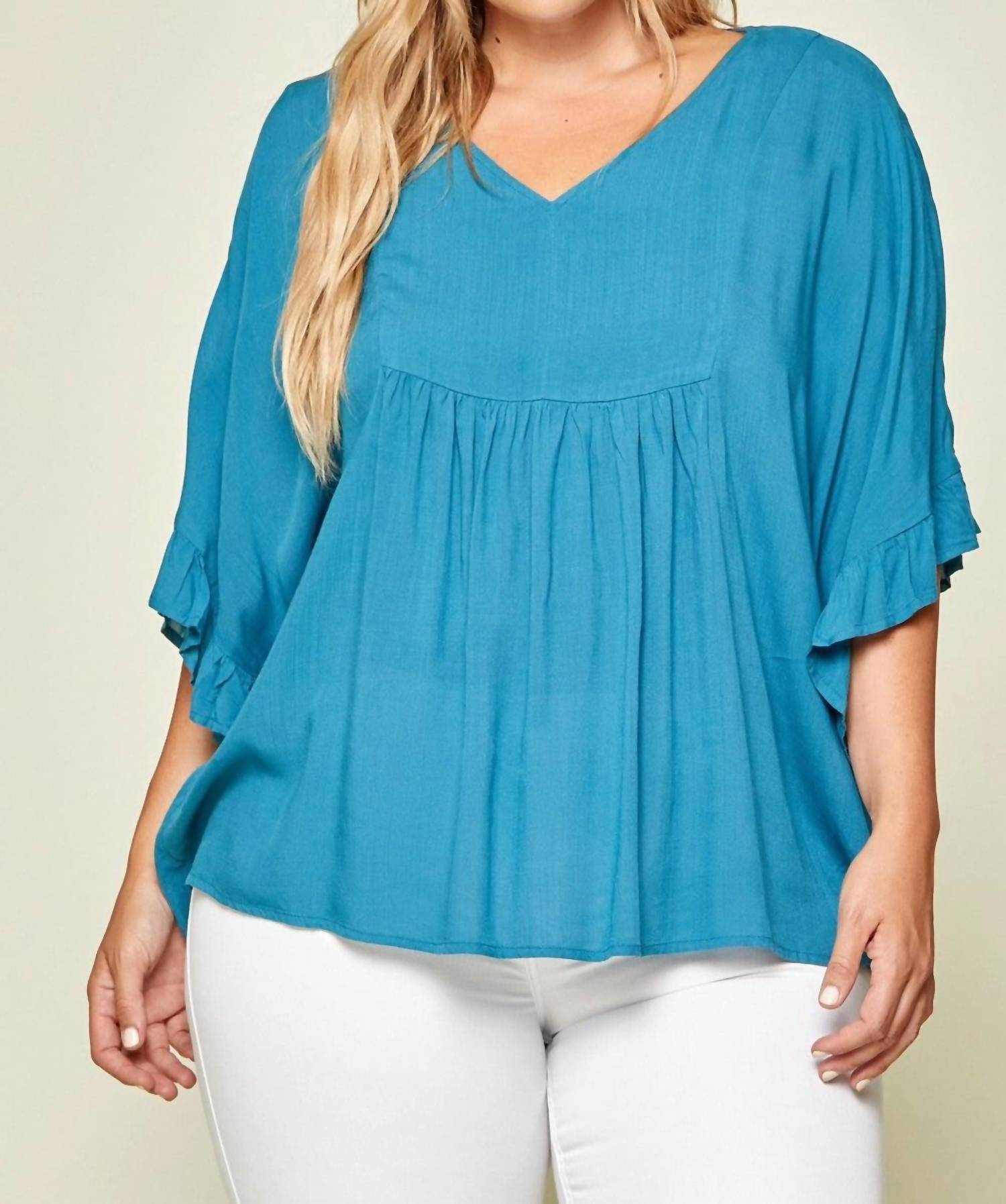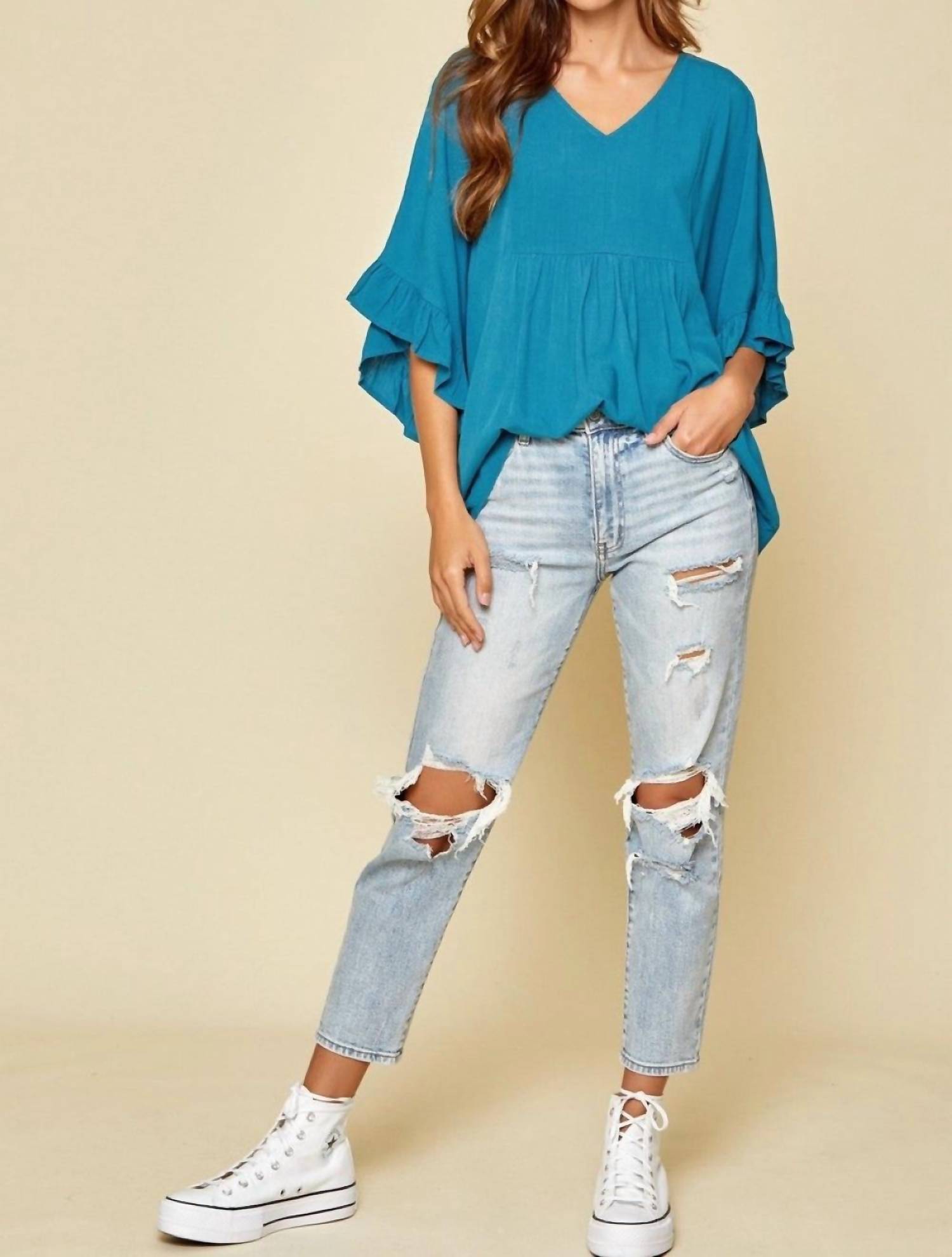 Introducing the Ruffle Sleeve Top by Andree By Unit, a chic addition to your wardrobe in a stunning teal color. This blouse showcases long dolman ruffle sleeves with a flattering V-neckline and a flowy, oversized bodice. Composed of 100% Rayon for a soft touch. Care is simple with hand wash cold instructions to maintain its pristine condition.