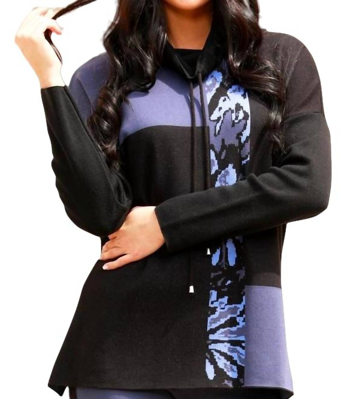Cotton/Acrylic Blend. Abstract Detail. Cowl Neck. Long Sleeve. Hits at waist. Delicate hand wash or dry clean. Imported