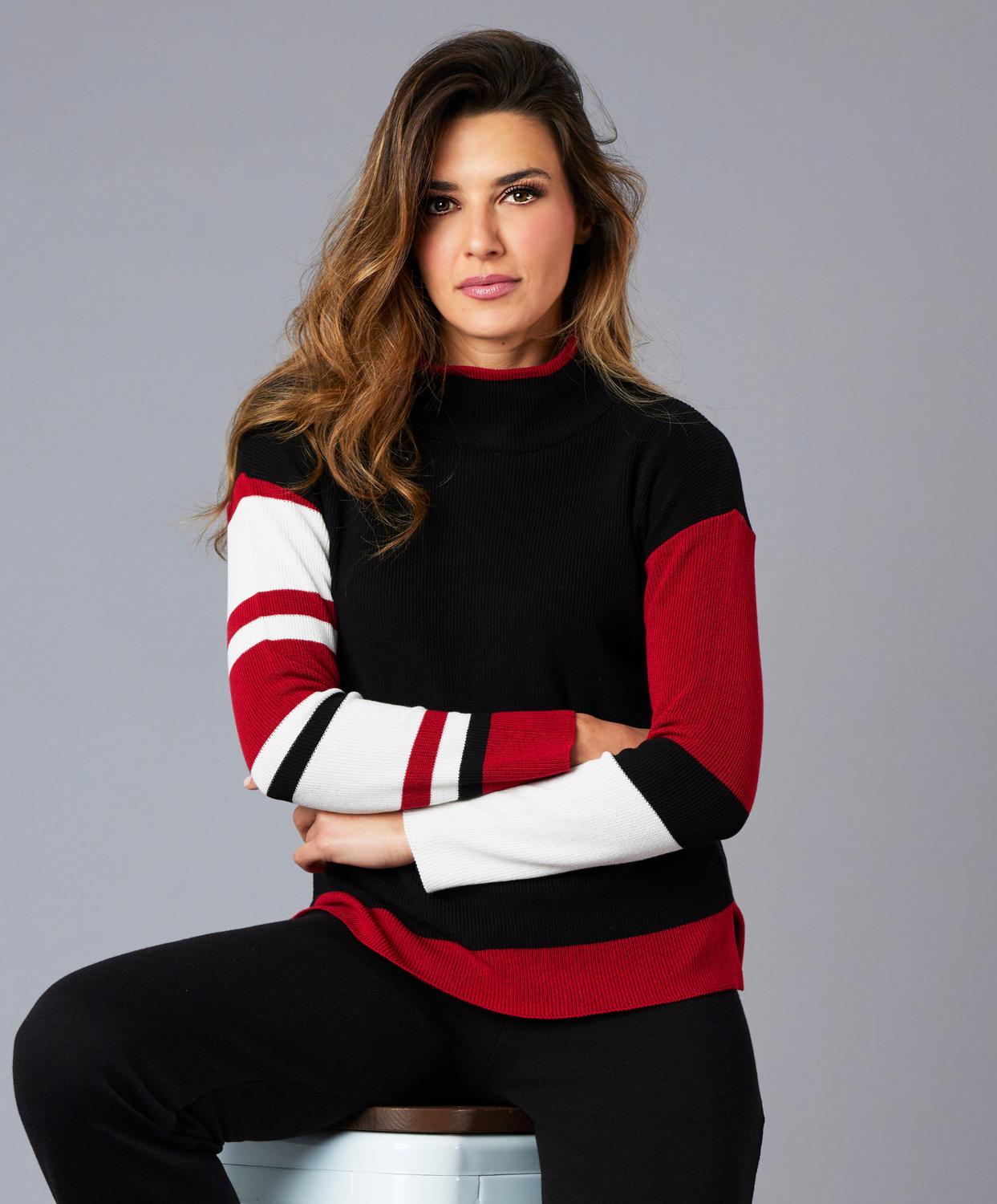 A classic staple that every closet needs. Mock neckline. Stripe detail. Long sleeve. Hits at hip. Cotton/Acrylic blend. Delicate hand wash or dry clean. Imported.