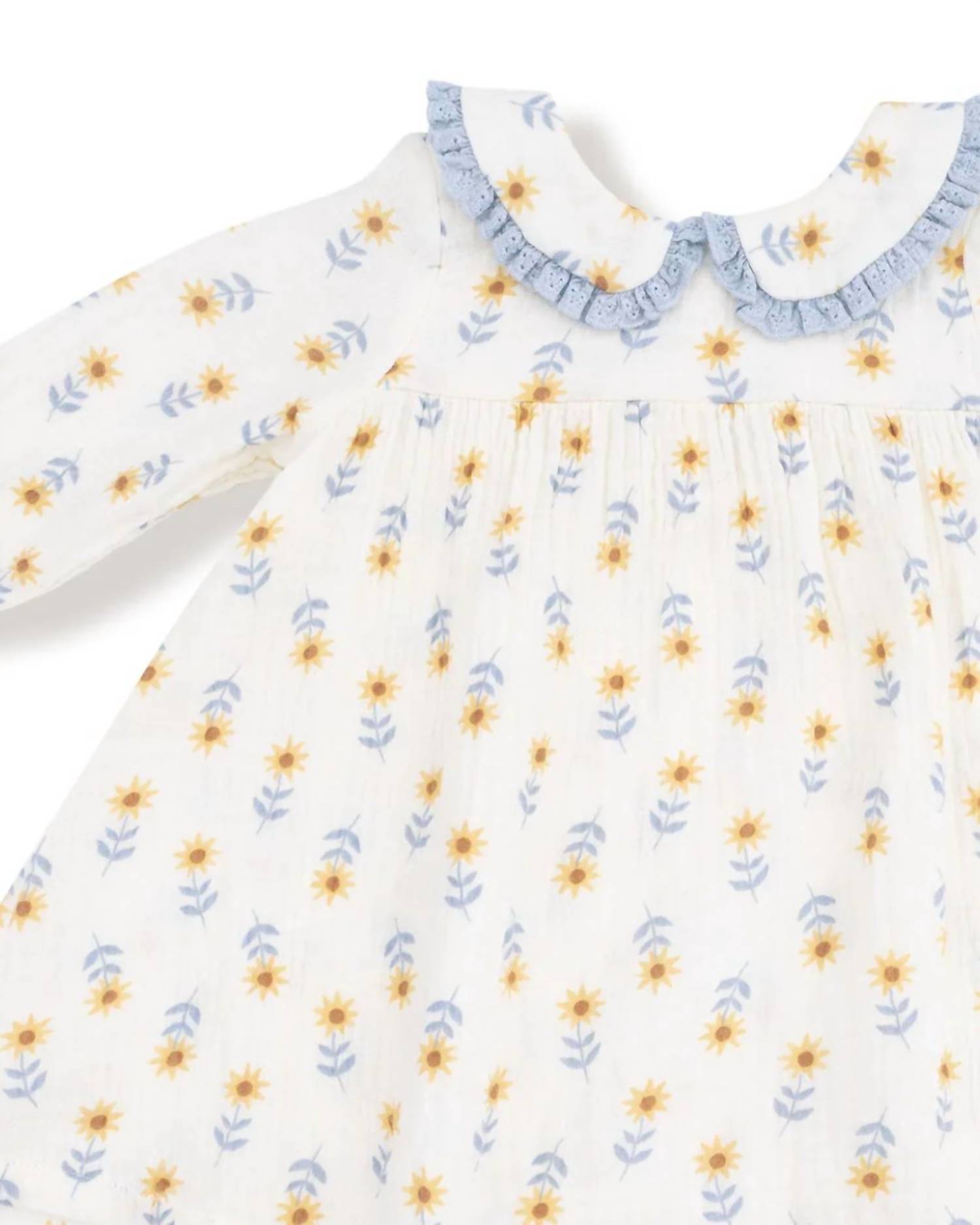 Bring sunshine to any day with the Angel Dear Western Sunflower Peter Pan Collar Dress, featuring delicate eyelet trim for a charming touch. Paired with soft ribbed leggings, this set combines comfort and whimsy, perfect for playful adventures or cozy cuddles. Bright, cheerful, and oh-so-sweet—your little one will love twirling in this delightful outfit.