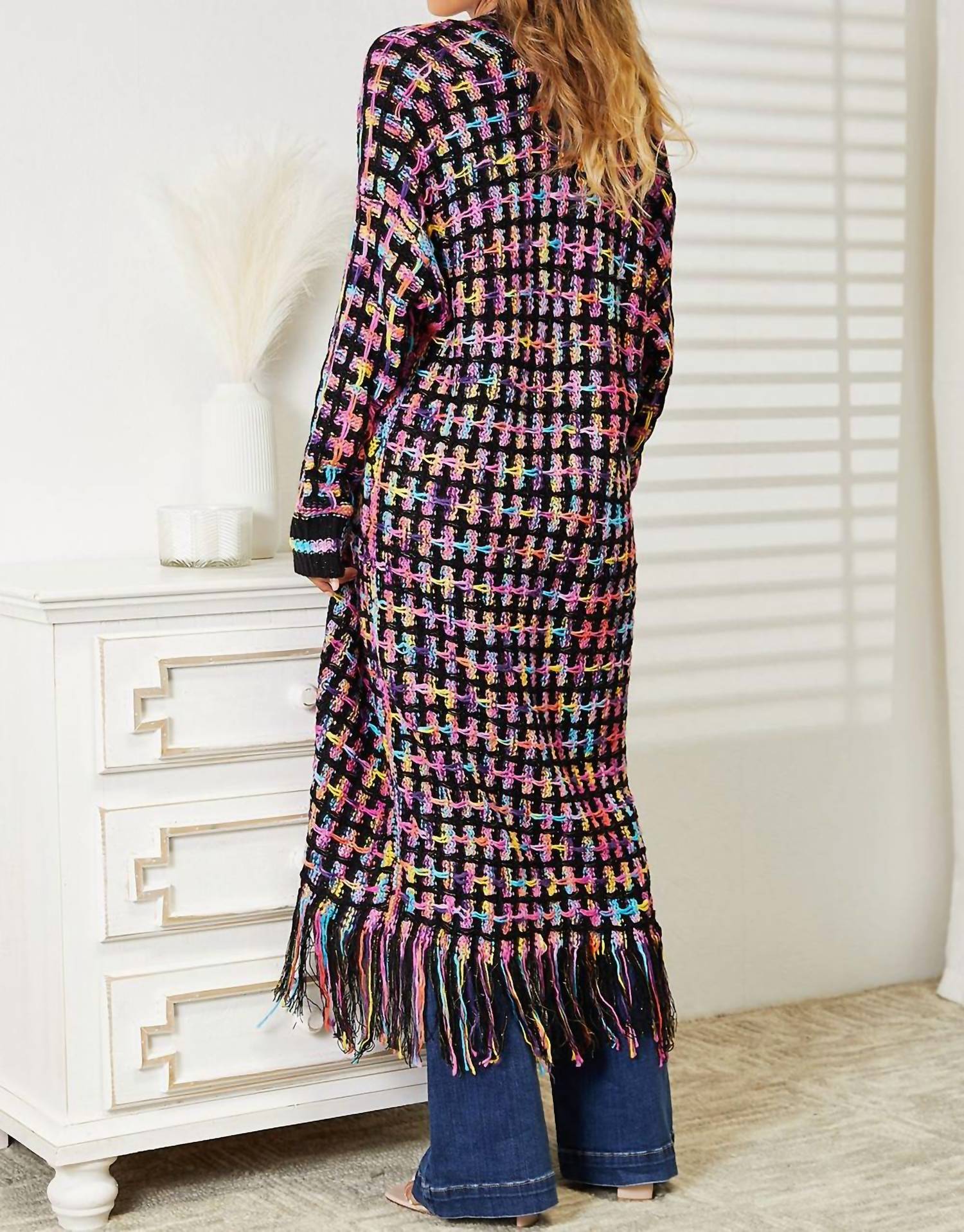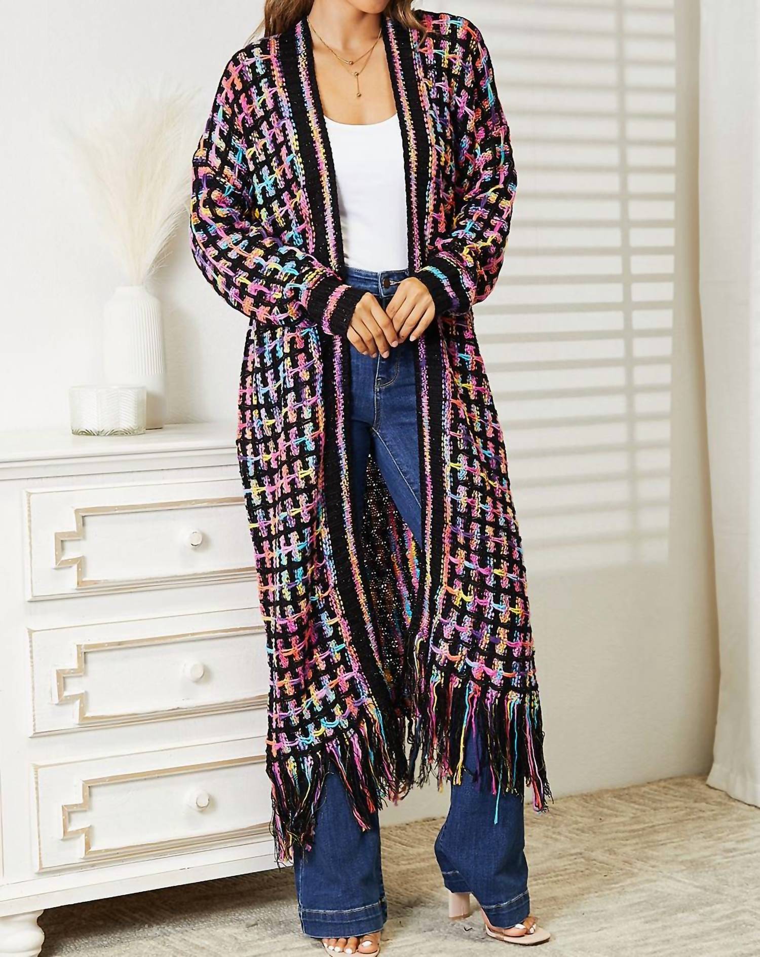 A classic fit that works just as good buttoned as it does left open. Embrace bohemian chic with the Full Size Multicolored Open Front Fringe Hem Cardigan by Angel Wings by Lucy. This long sleeve cardigan is crafted from 100% acrylic, showcasing a playful multicolored pattern and a trendy fringe hem. It features a pull-on closure for effortless wear, and is imported with care instructions advising machine wash cold and tumble dry low. Available in sizes S through 3XL, with detailed measurements provided to ensure your perfect fit for any spring dinner party ensemble.