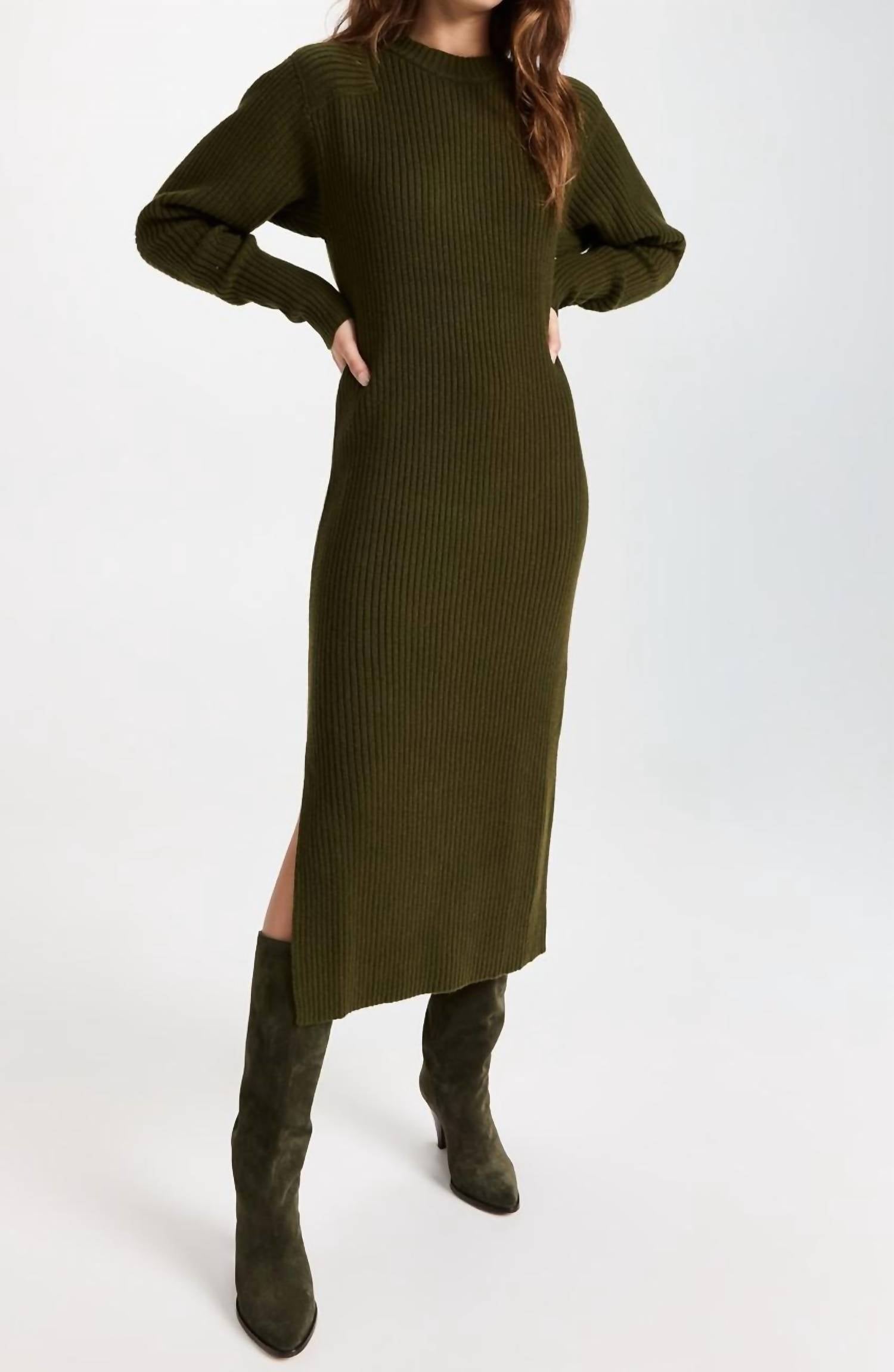 A midi dress so versatile, your options for wearing it are endless. Elevate your wardrobe with the Aurora Dress by ANINE BING, a sophisticated midi-length piece in textured Army Green. Tailored with long sleeves, this sweater dress features a stylish crew neckline and subtle shoulder padding crafted for a relaxed silhouette. Made in a high-quality blend of 50% Nylon, 35% Wool, and 15% Acrylic, it boasts a comfortable pull-on closure and a chic side seam slit. Care for this elegant piece with dry cleaning to maintain its refined shape. Length: 47.25 inches.