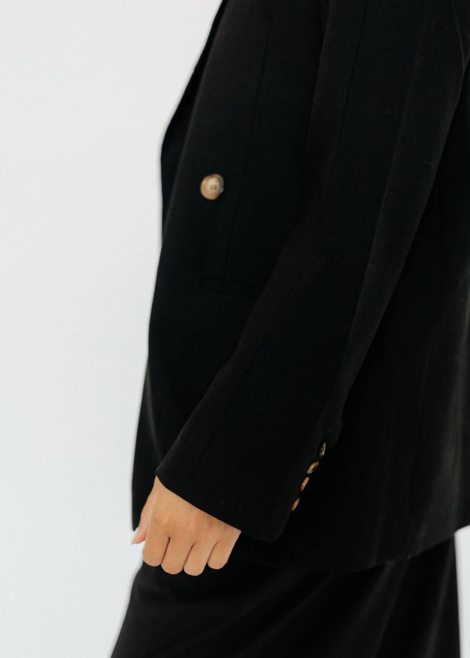 The Kaia Blazer by ANINE BING is a classic piece that embodies effortless style with its long sleeves and a sophisticated wool blend. Crafted from 55% polyester and 45% wool, this black blazer is made in Turkey and features a wide double-breasted button closure for a timeless look. The design includes a chic collar and multiple pockets for practicality, making it perfect for occasions like a dinner party. For care, it is recommended to dry clean this fashion-forward workwear staple.