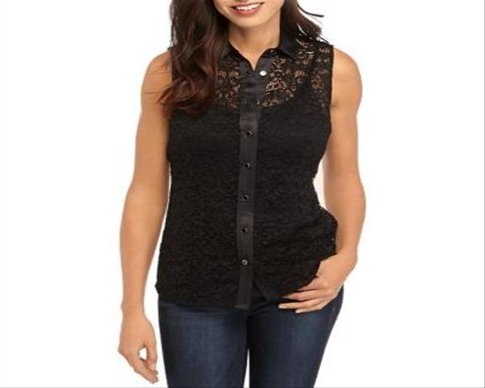 Anne Klein Women's Corded LACE Sleeveless Button Front Blouse Black Size 16