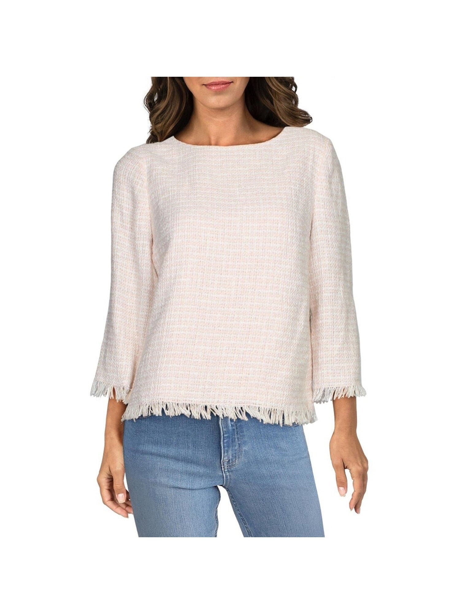 Anne Klein Women's Frayed Patterned Long Sleeve Jewel Neck Top White Size Large