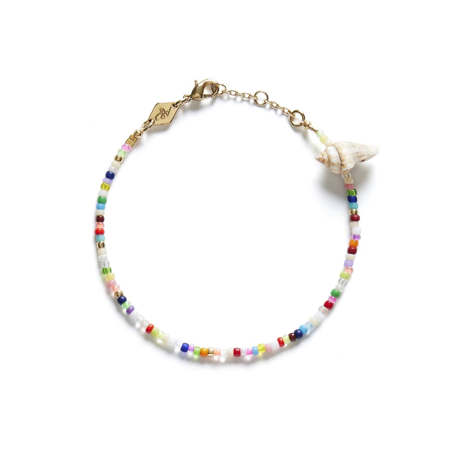 Inspired by the lively spirit of a festive gathering, this shell bracelet brings a joyful, carefree vibe to your look. Crafted in brass with 18-karat plating and an extra protective coating, it features delicate glass beads and Nassa persica shell accents. The adjustable length (16–18 cm) ensures a comfortable fit, finished with a secure lobster clasp for easy wear.