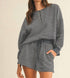 The Coastline Stripe Set by AnnieWear is your go-to loungewear, crafted for style and comfort in grey. This women's two-piece set includes a long sleeve crewneck pullover and elastic tie waistband shorts, made from ultra-soft brushed knit fabric with a classic pinstripe pattern. Designed with a relaxed, loose fit, it combines effortless style with cozy, lightweight wearability, perfect for summer days spent lounging or on-the-go. Whether worn together or mixed with everyday basics, this set offers true-to-size comfort and timeless appeal.
