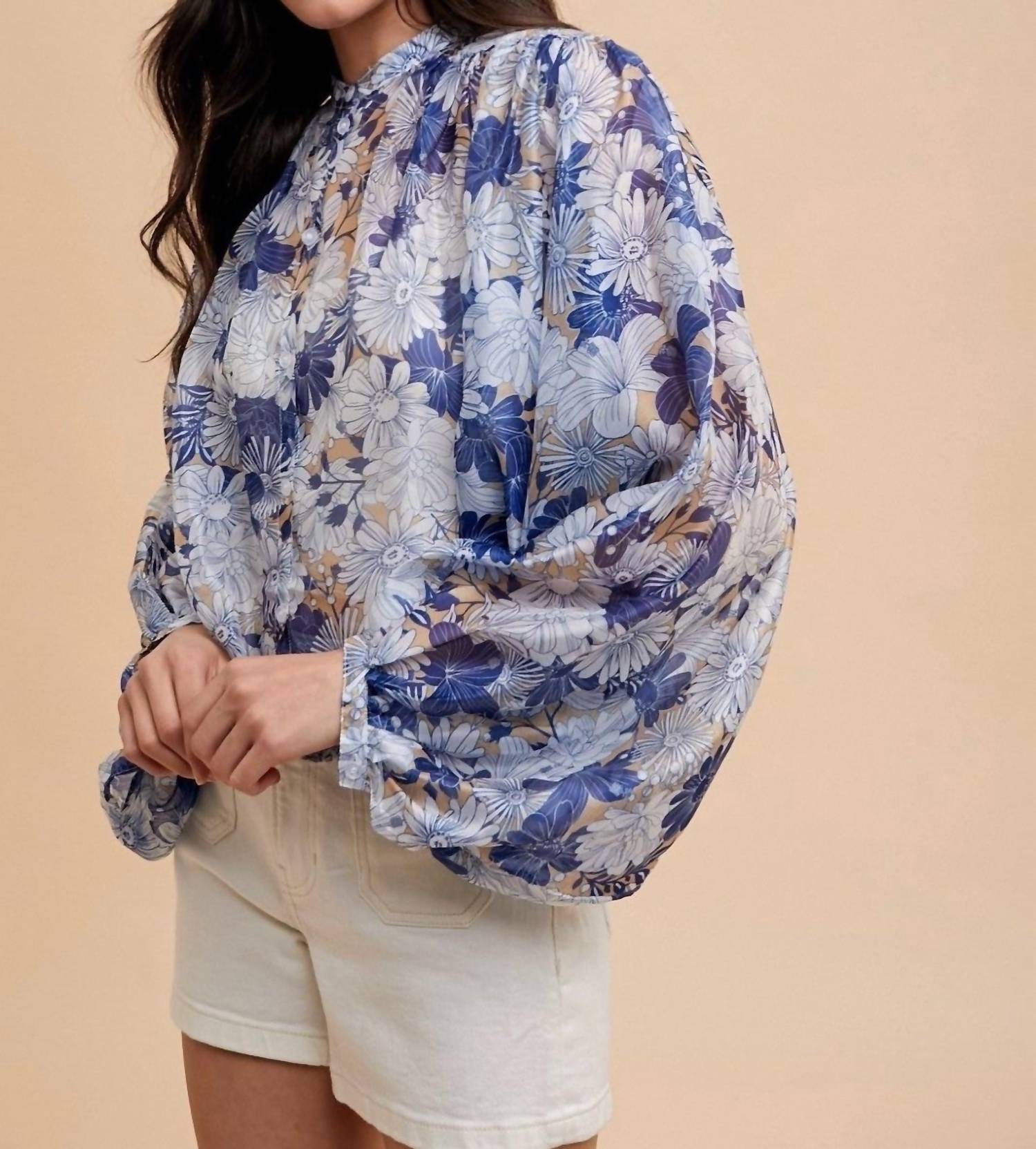 A timeless blouse that will never go out of style. Embrace the Boho Chic trend with AnnieWear's Flower Printed Loose Fit Button Down Volume Blouse in a captivating Blue Floral design. This blouse is designed with long sleeves and a mockneck, perfect for a Spring dinner party or Easter gathering. Closure: Button closure.