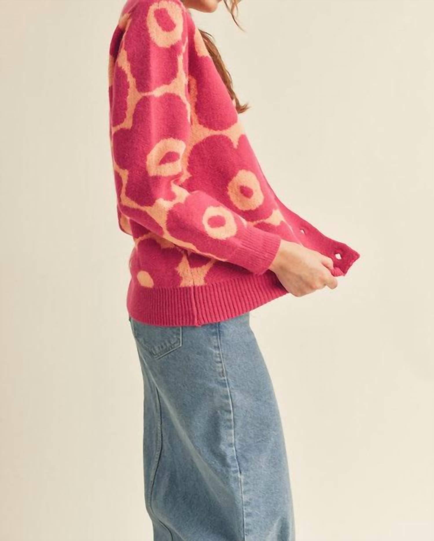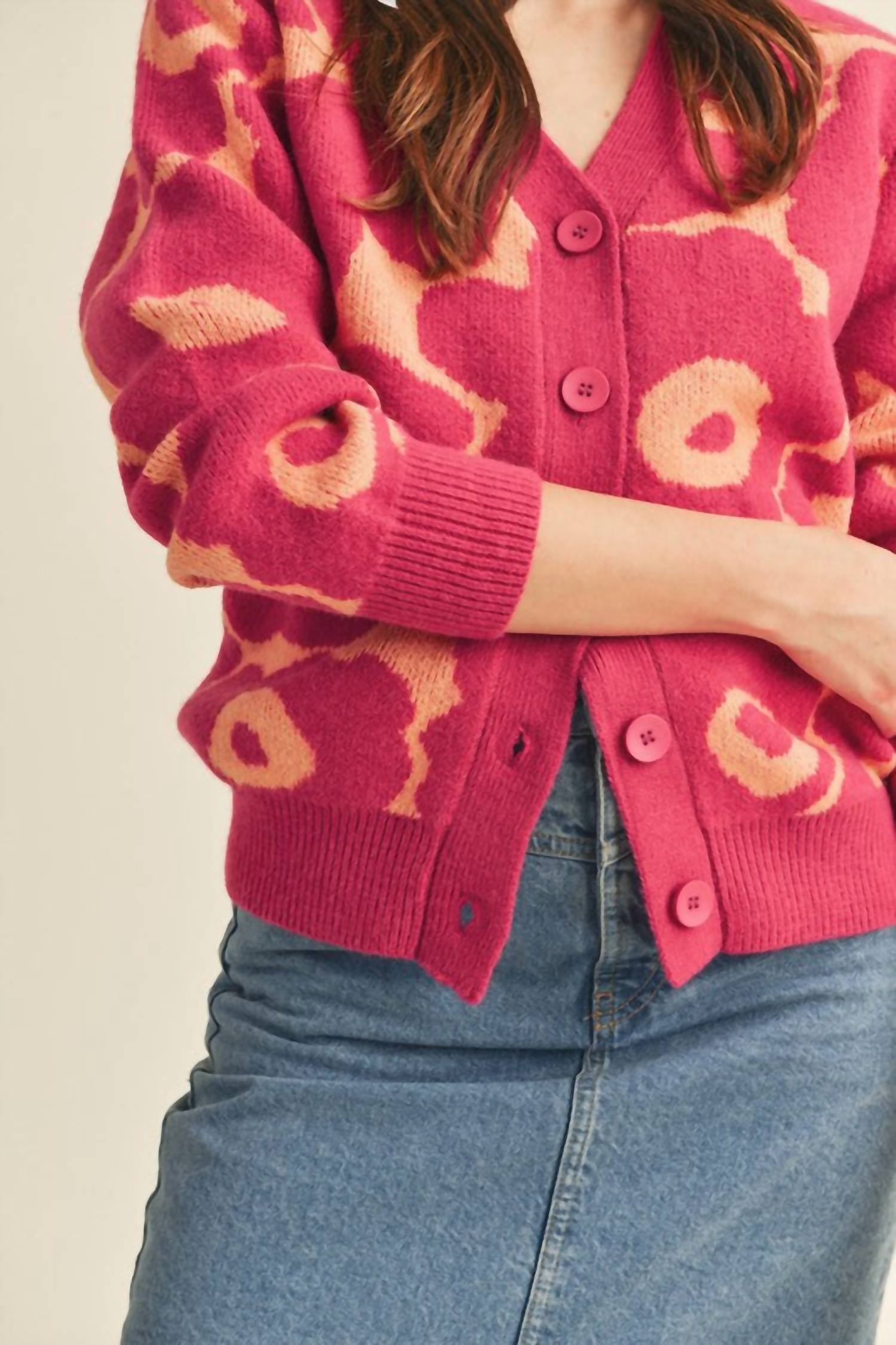 A classic fit that works just as good buttoned as it does left open. Introducing the Quiet Spring Floral Cardigan by AnnieWear, a vibrant magenta piece that brings joy to any wardrobe. This long sleeve cardigan is adorned with an abstract floral pattern and features a button closure for a secure fit. Its v-neckline and waist length enhance the relaxed design, making it perfect for travel or Thanksgiving gatherings. Crafted for boho chic enthusiasts, this cardigan is an excellent addition for fall attire.