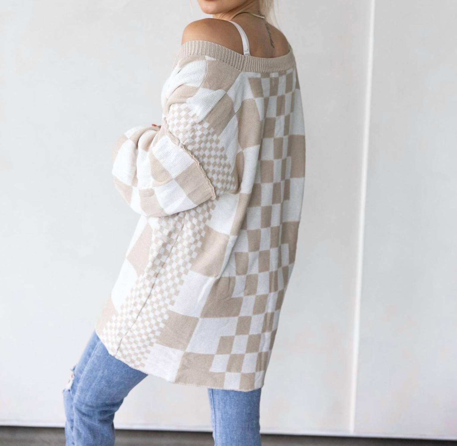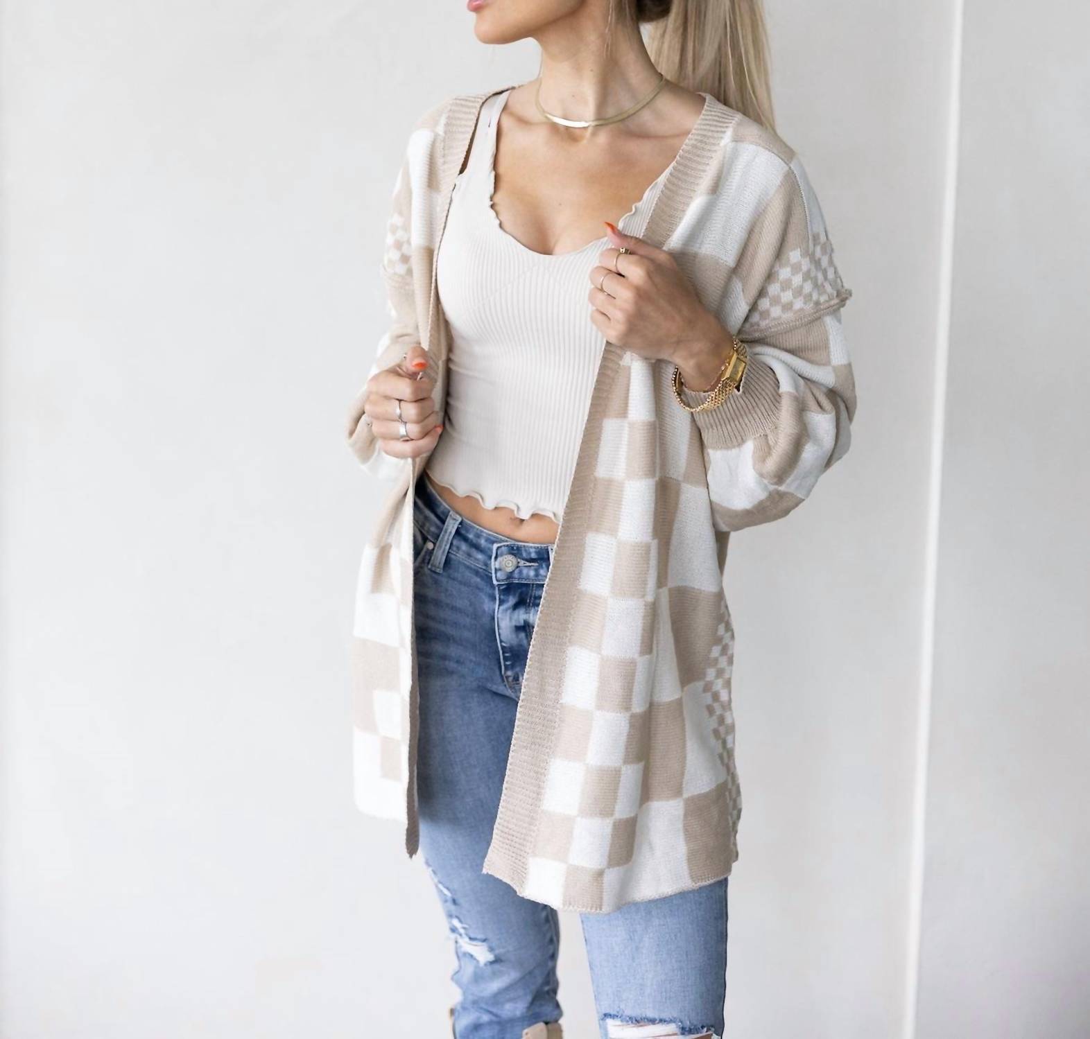 This cardigan will be a sweater-rotation favorite. Introducing the Shaina Checkered Open Cardigan by AnnieWear, a stylish addition to your fall wardrobe with its on-trend boho chic design. With long sleeves and a relaxed fit, this cardigan features a multi-checkerboard pattern that is perfect for travel occasions like Thanksgiving. Crafted in an 83% Viscose, 17% Nylon blend, it offers a medium weight ideal for year-round wear. The drop shoulder design with exposed seam details complements the semi-open knit finish, enhancing its laid-back appeal.