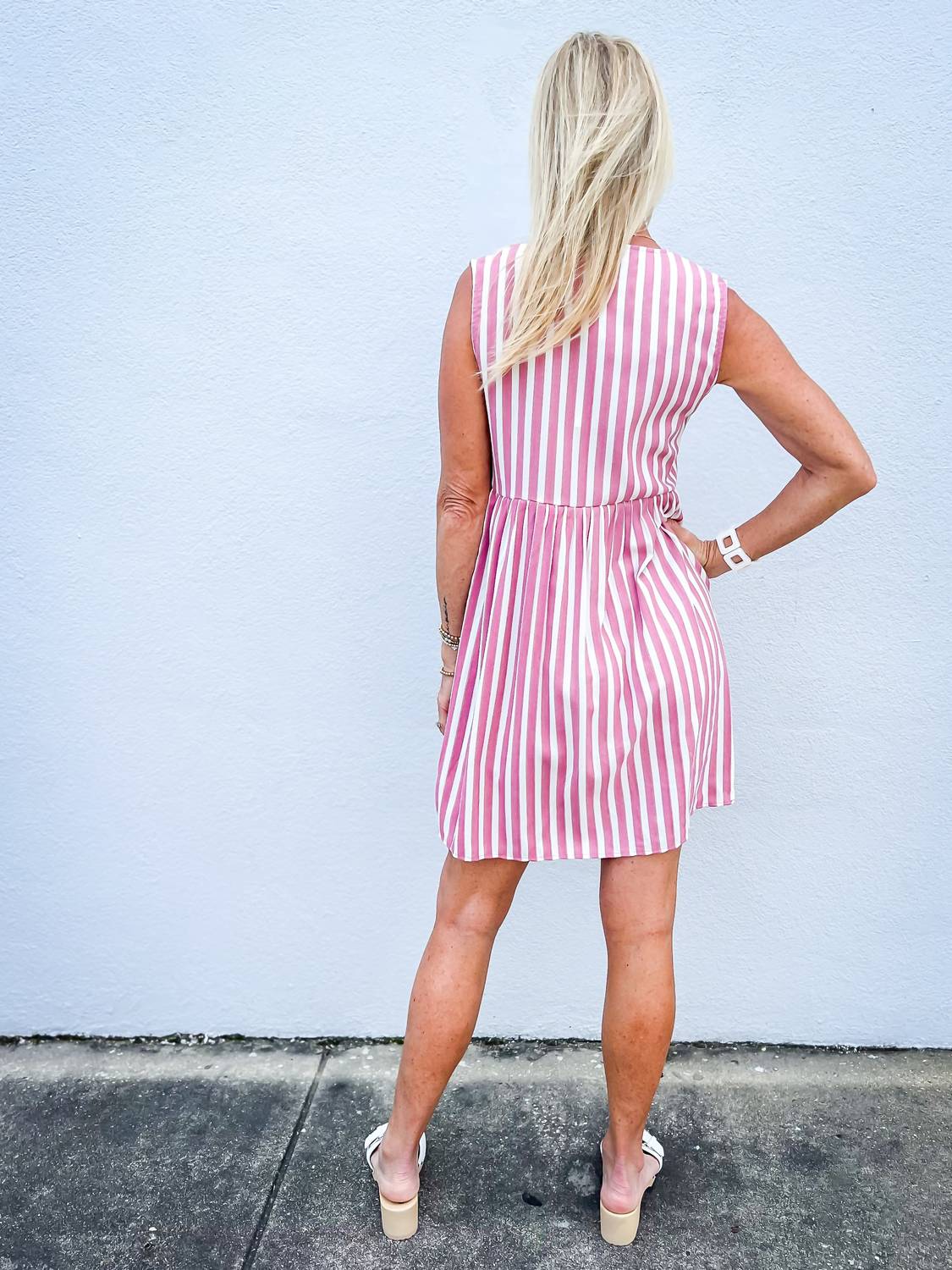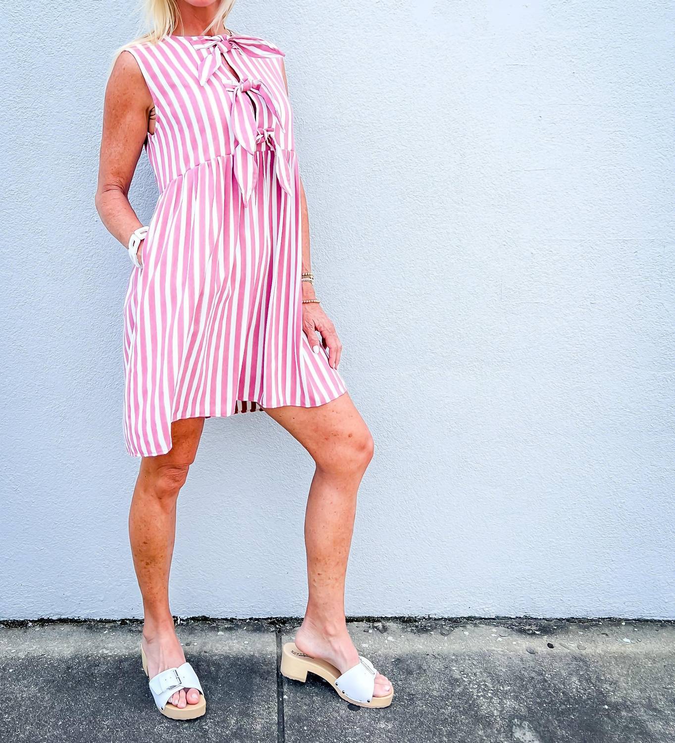 The kind of easy and flattering dress you'll be reaching for all season long. Discover the Tied With A Bow Striped Babydoll Dress by AnnieWear, a sweet and effortless piece in a charming rose hue. This sleeveless mini dress crafted from a soft and breathable 50% Cotton, 50% Polyester blend features an adorable front tie bow and a flattering babydoll fit. Boasting a relaxed feel without stretch, it measures Small - 35”, Medium - 36”, Large - 37”, X-Large - 38” in length. Closure: Tie Closure. Care: Hand wash cold, lay flat to dry.