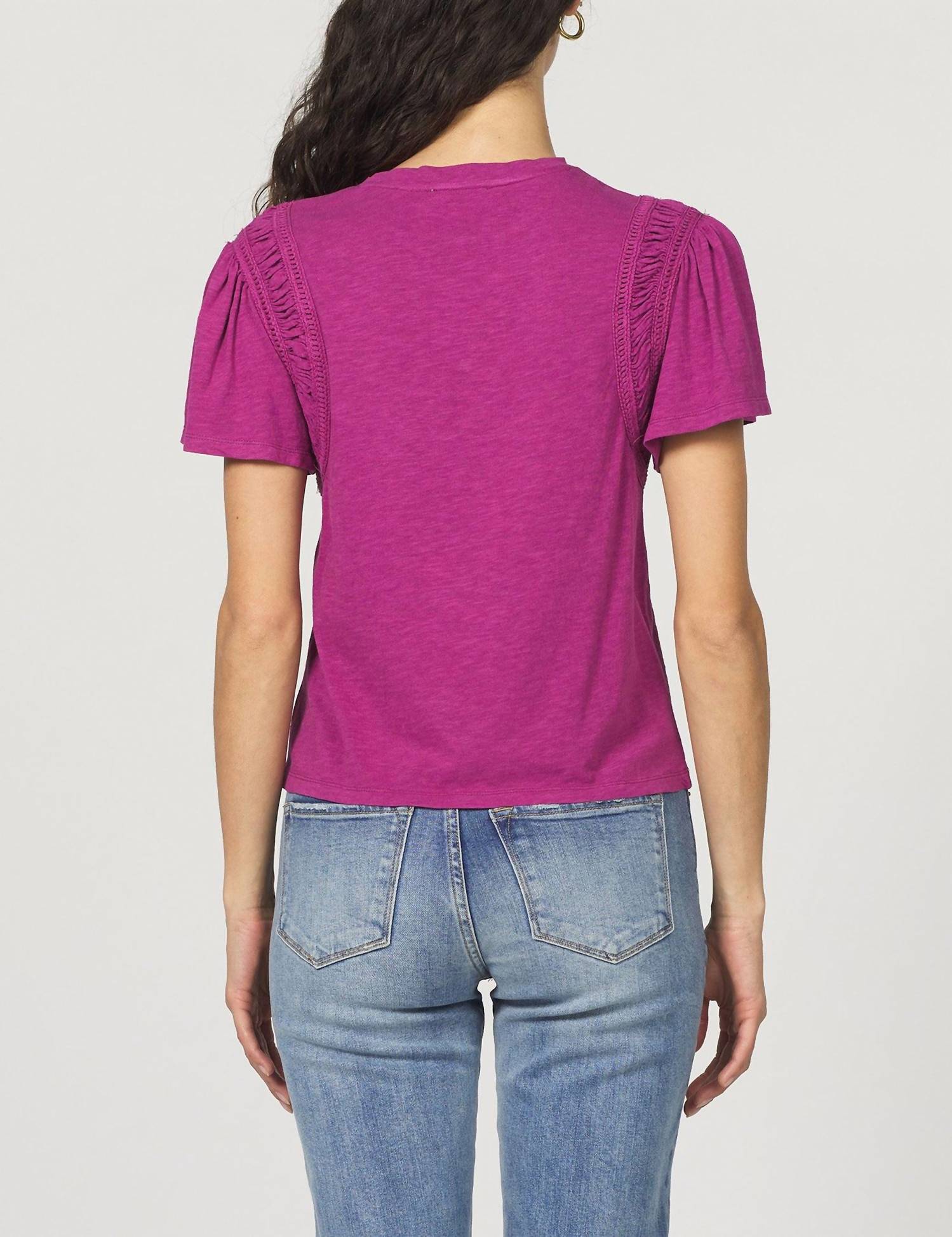 The short sleeve tee you'll want in every color. Elevate your style with the Francie Flutter Sleeve Top by Another Love in a radiant orchid hue. This women’s short-sleeve tee is crafted from a comfortable cotton blend, featuring 60% cotton and 40% rayon. The delicate flutter sleeves and lace trim detail offer a soft, feminine touch, making it ideal for your everyday wardrobe. Designed with a crewneck and easy pull-on closure, this top is perfect for effortless comfort.