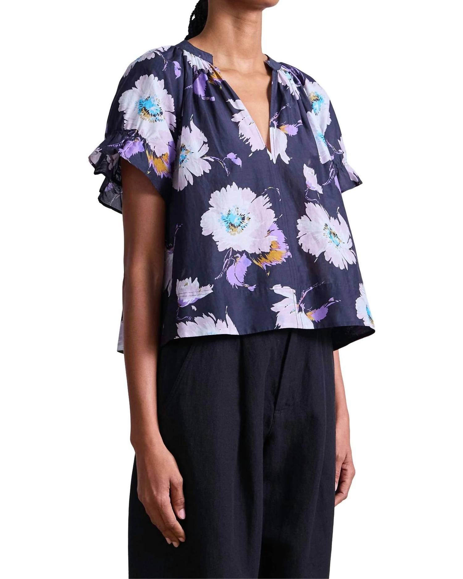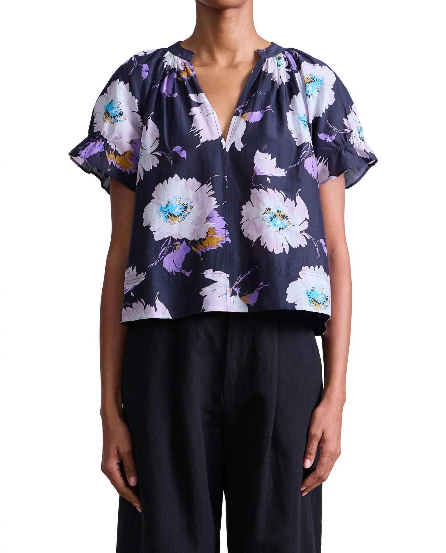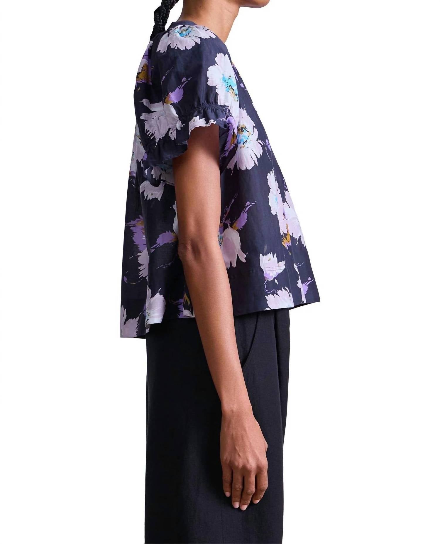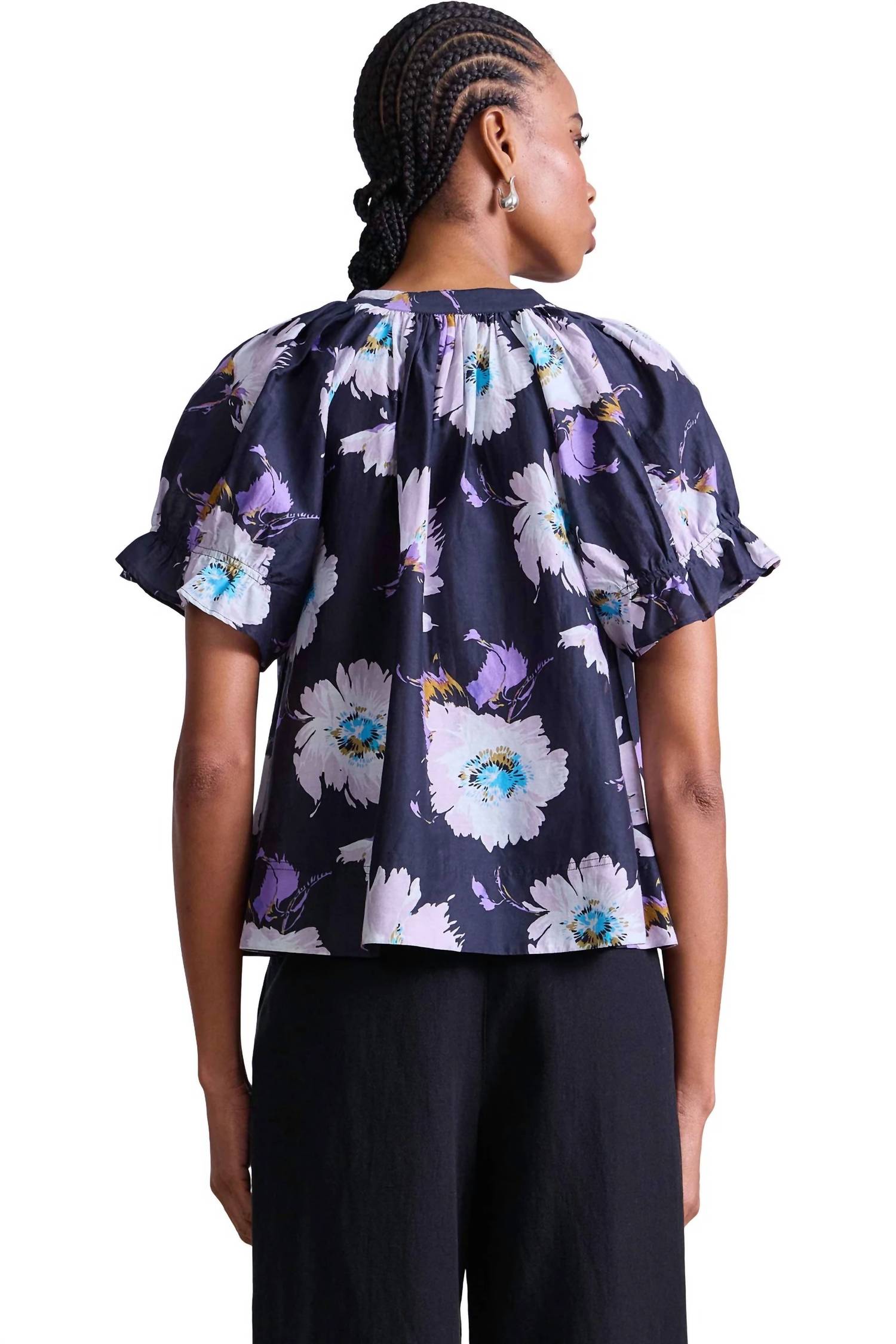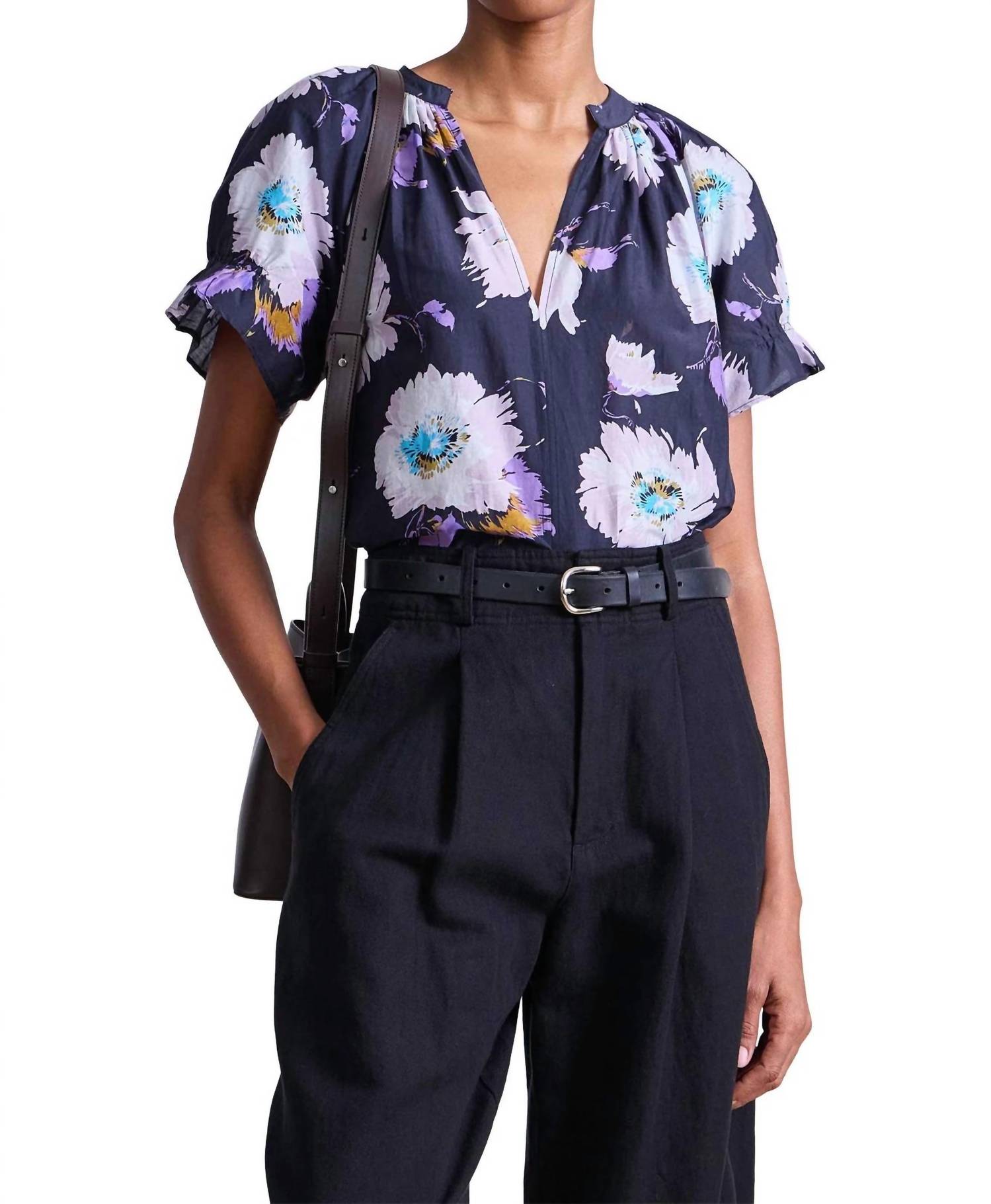 A versatile blouse that works from desk to dinner! Discover the Lo Capo Top by APIECE APART, a chic addition to your wardrobe with its minimalist floral design in Senna Floral Navy. This women's blouse features a flattering V-neckline and short sleeves, crafted from a luxurious blend of 80% cotton and 20% silk. The top is made for easy wear with a convenient pull-on closure, perfect for spring gatherings such as a Thanksgiving dinner party. Care instructions recommend dry cleaning to maintain its elegant style.