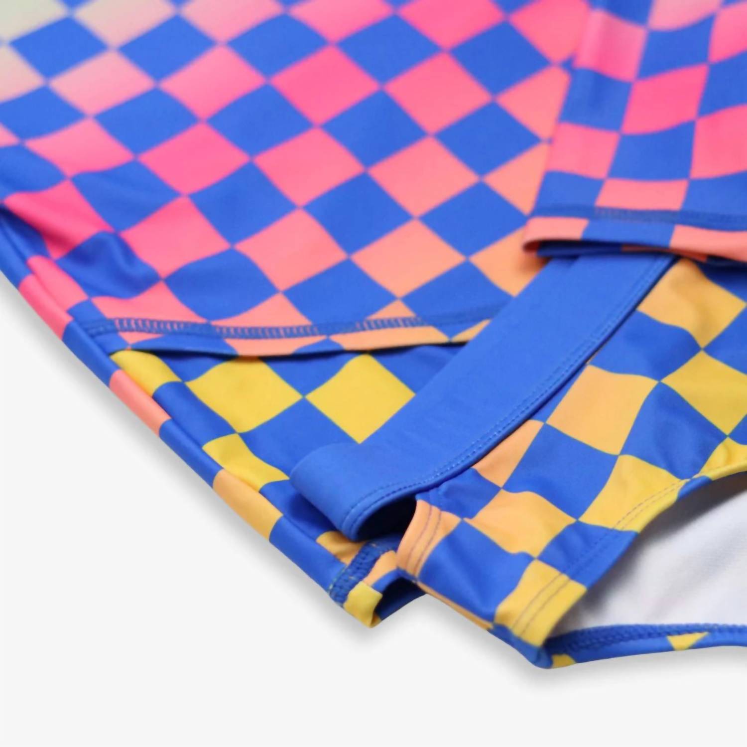 Dive into style with the Girls' Oceana Rash Guard Set by Appaman, showcasing vibrant checkerboard prints in blue, yellow, pink, orange, and green. This long sleeve rash guard is crafted with 85% polyester and 15% elastane for a comfortable fit, featuring a 100% polyester bottom lining and offering UPF protection. Imported from high-quality materials, it ensures a fun and secure beach day for active girls. For best care, rinse immediately after use and machine wash cold; drip dry in shade.